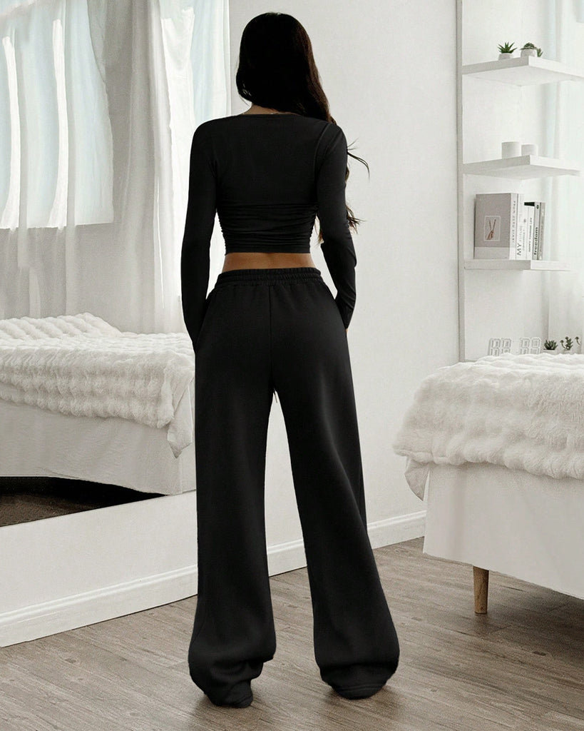 Black Round Neck Fitted Long Sleeve Top & Wide-Leg Pants Set