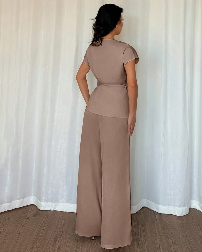 Chocolate Fondae Short Sleeve Wrap Top & Wide-Leg Pants Set