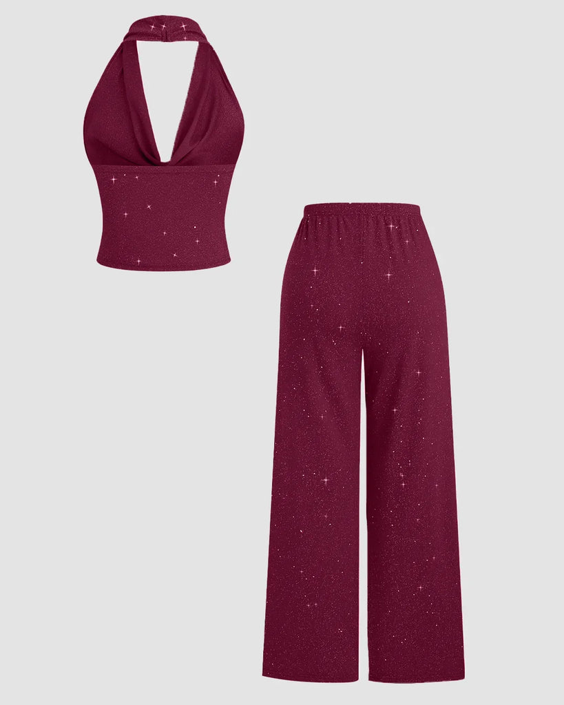 Maroon Halter Neck Crop Top & Wide-Leg Trousers Co-ords Set