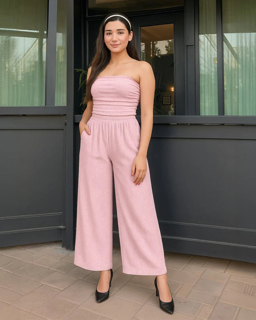 This crop top and pants set blends playful charm with relaxed elegance. The ruched strapless crop top gives a flattering silhouette, while the wide-leg pants create an airy, comfortable flow. Ideal for daytime outings, vacations, or chic evening gatherings.