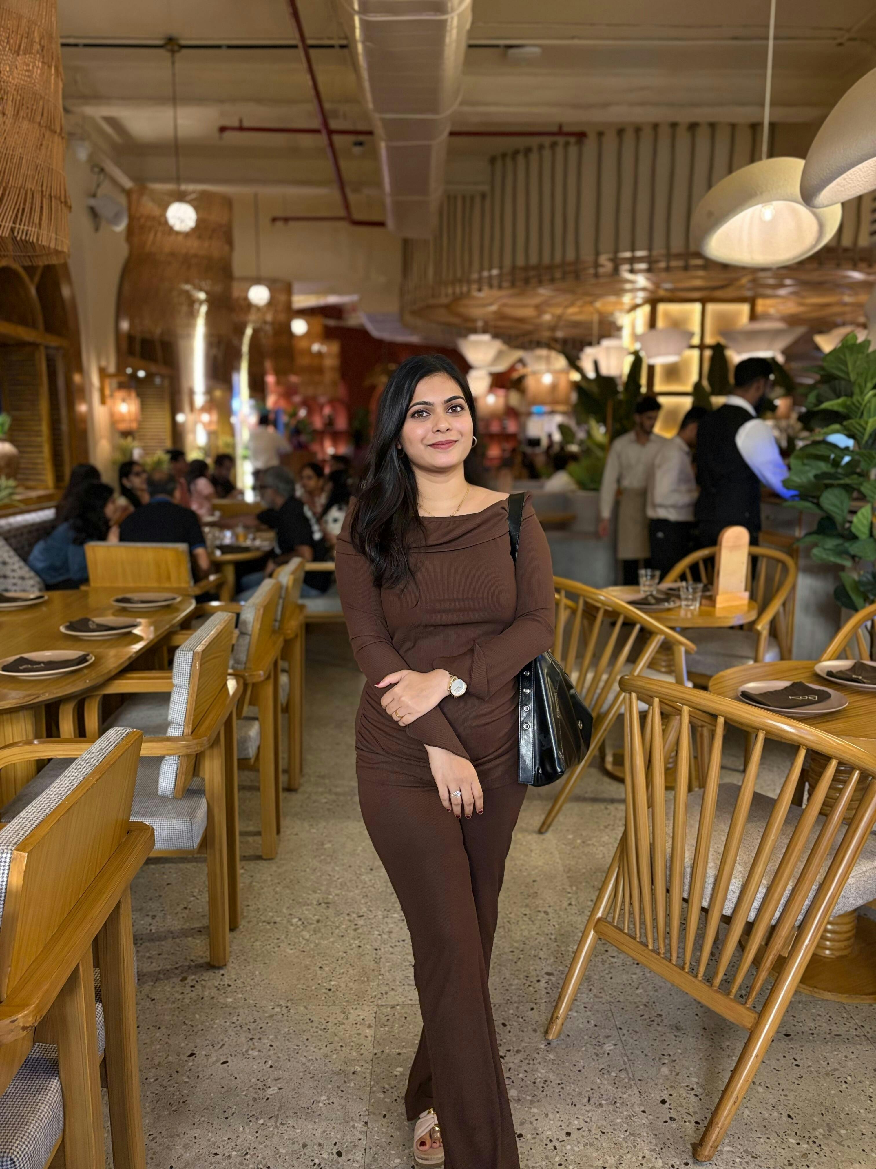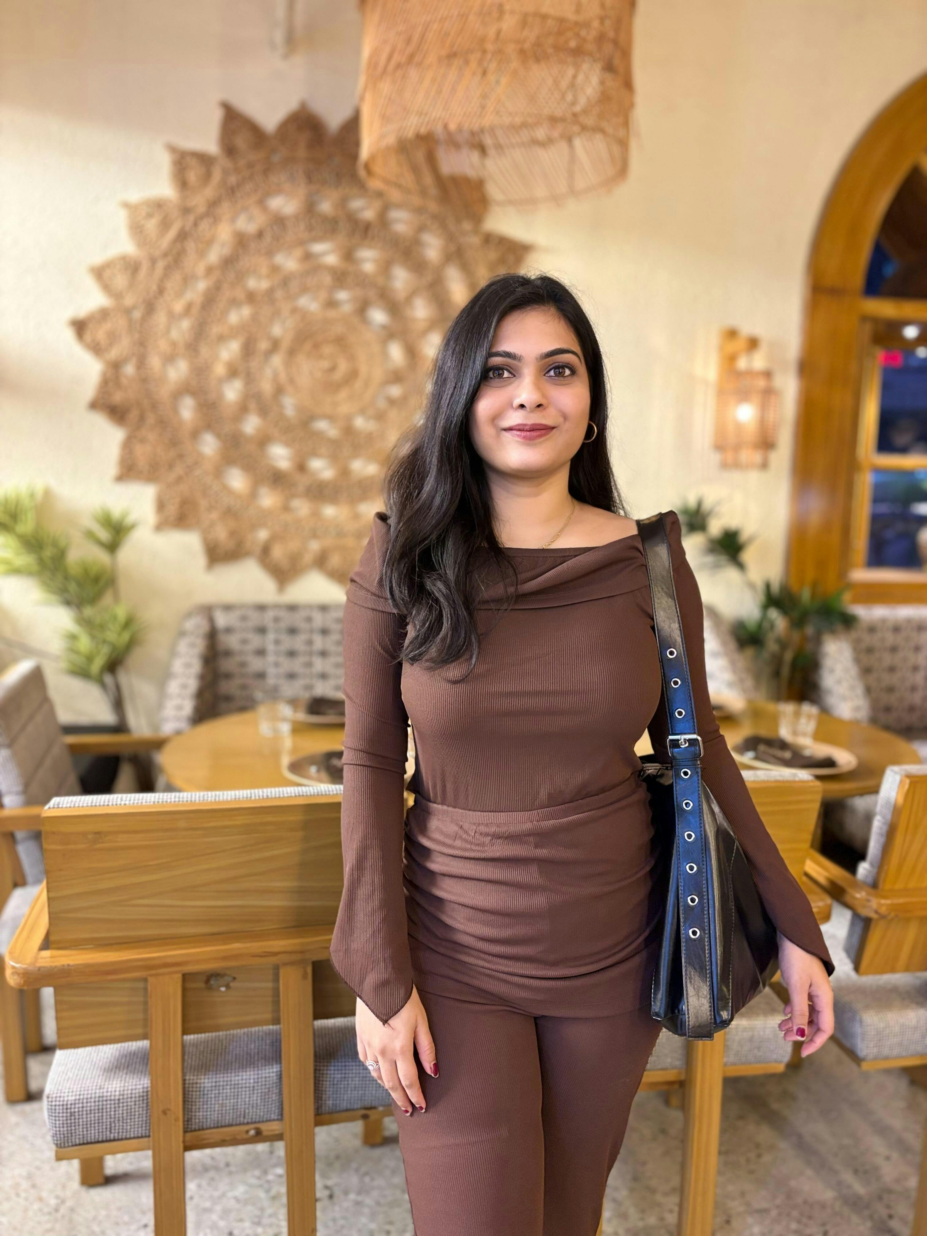 Introducing our Off Shoulder Long-Sleeve Asymmetrical Top And Mid Rise Flared Pant In Chocolate Brown.