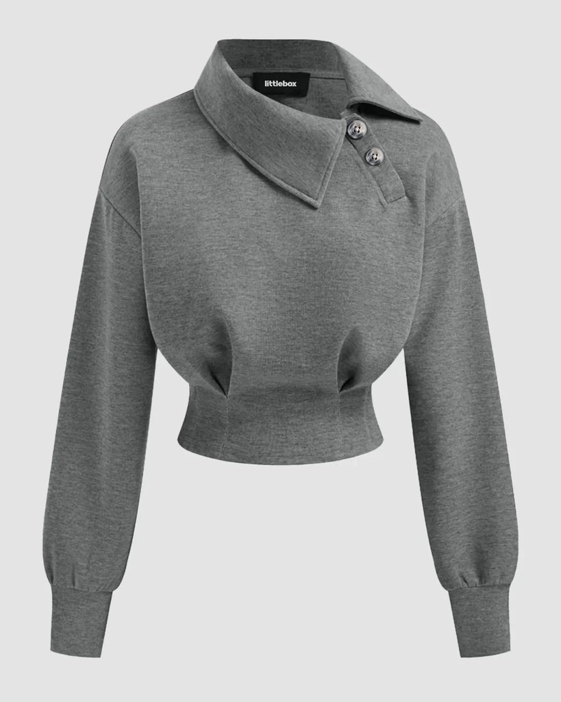 White blouse with long sleeves, a long collar, pleated peplum waist, and button closure