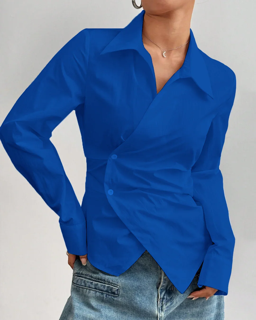 This blue shirts style brings bold tailoring with a modern twist. Designed with a sharp collared neckline and fitted silhouette, it defines the waist beautifully. The asymmetric hem adds an unexpected edge, making this blue shirts piece stand out effortlessly. The rich surf blue tone feels fresh and confident, perfect for statement dressing. Structured yet comfortable, this blue shirts design keeps your look polished without feeling too formal.