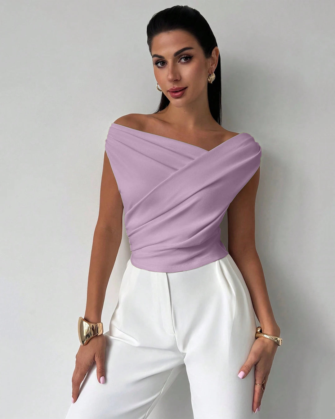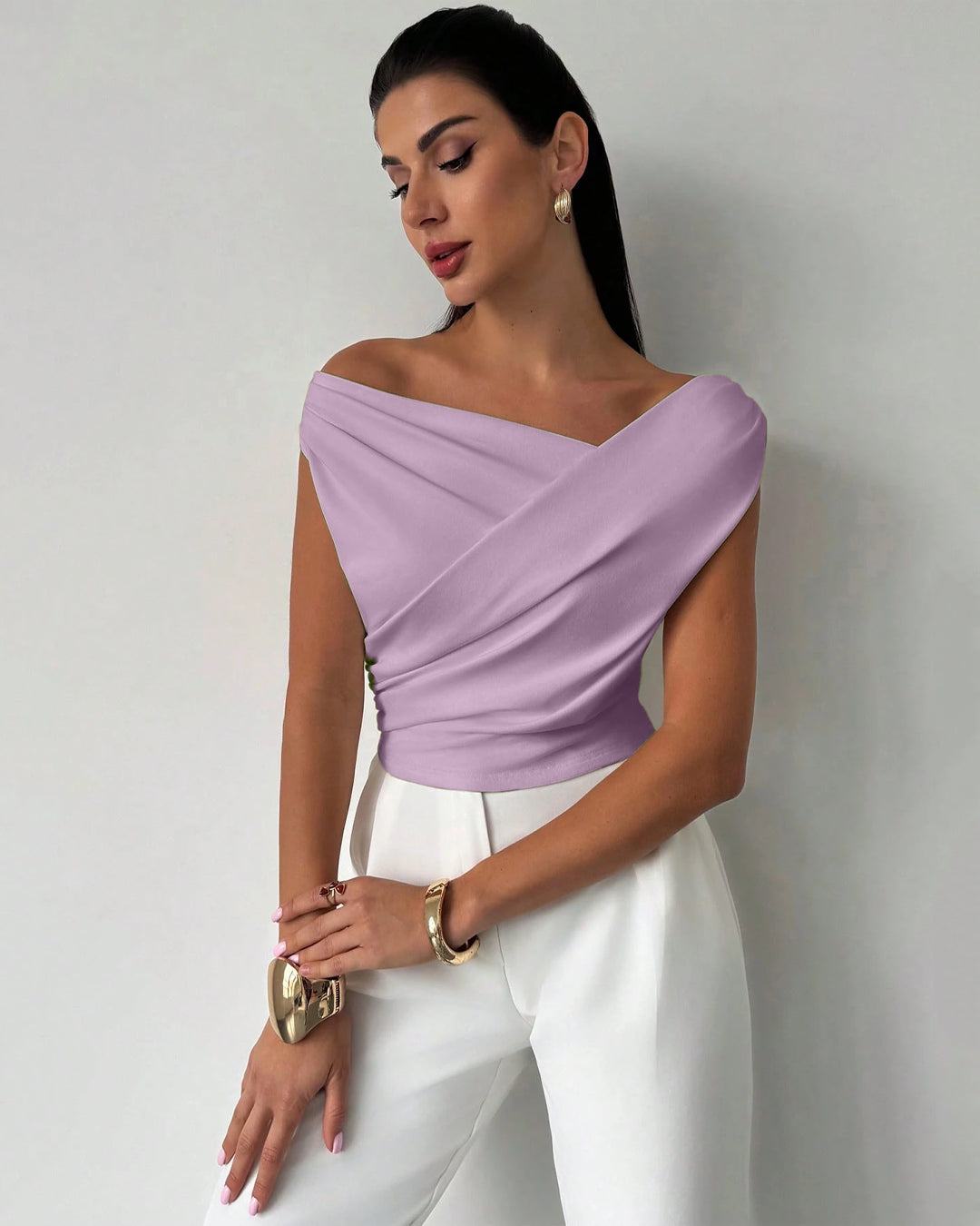 Asymmetric Neck Drape Cropped Top in Lilac is modern, sleek, and effortlessly elegant. Designed with a statement asymmetric neckline and soft draped detailing, this cropped top creates a flattering, sculpted silhouette. The off-shoulder inspired cut highlights the collarbone beautifully, adding a subtle touch of sophistication.