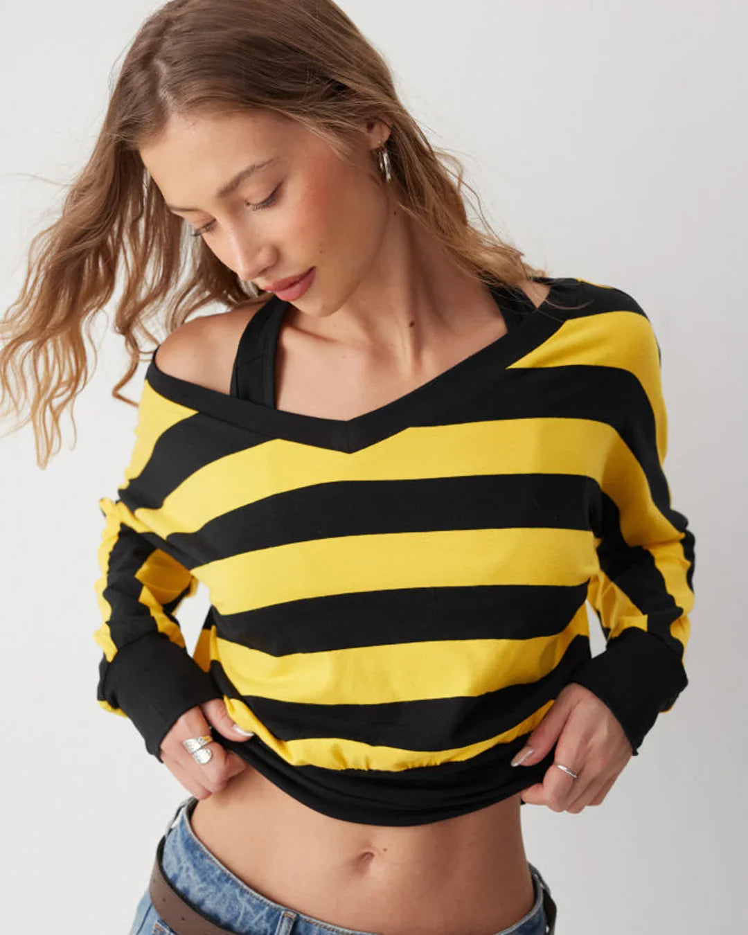 Asymmetrical Neck Long Sleeve Striped Two Tone Top