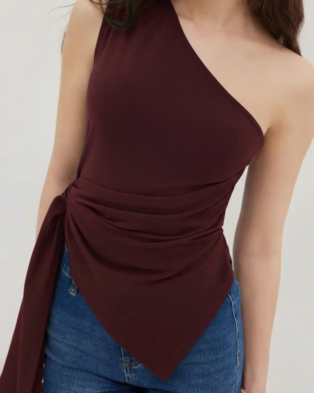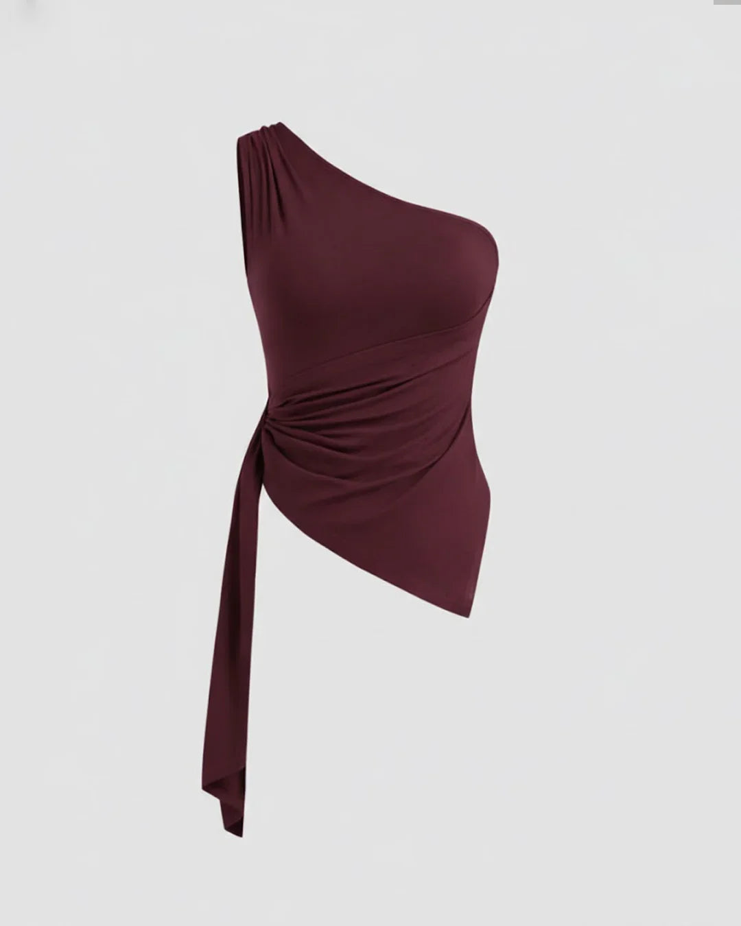 Whether paired with jeans for a chic daytime look or tailored trousers and heels for a night out, this Asymmetrical Neck Ruched Tank Top delivers confident, standout style.