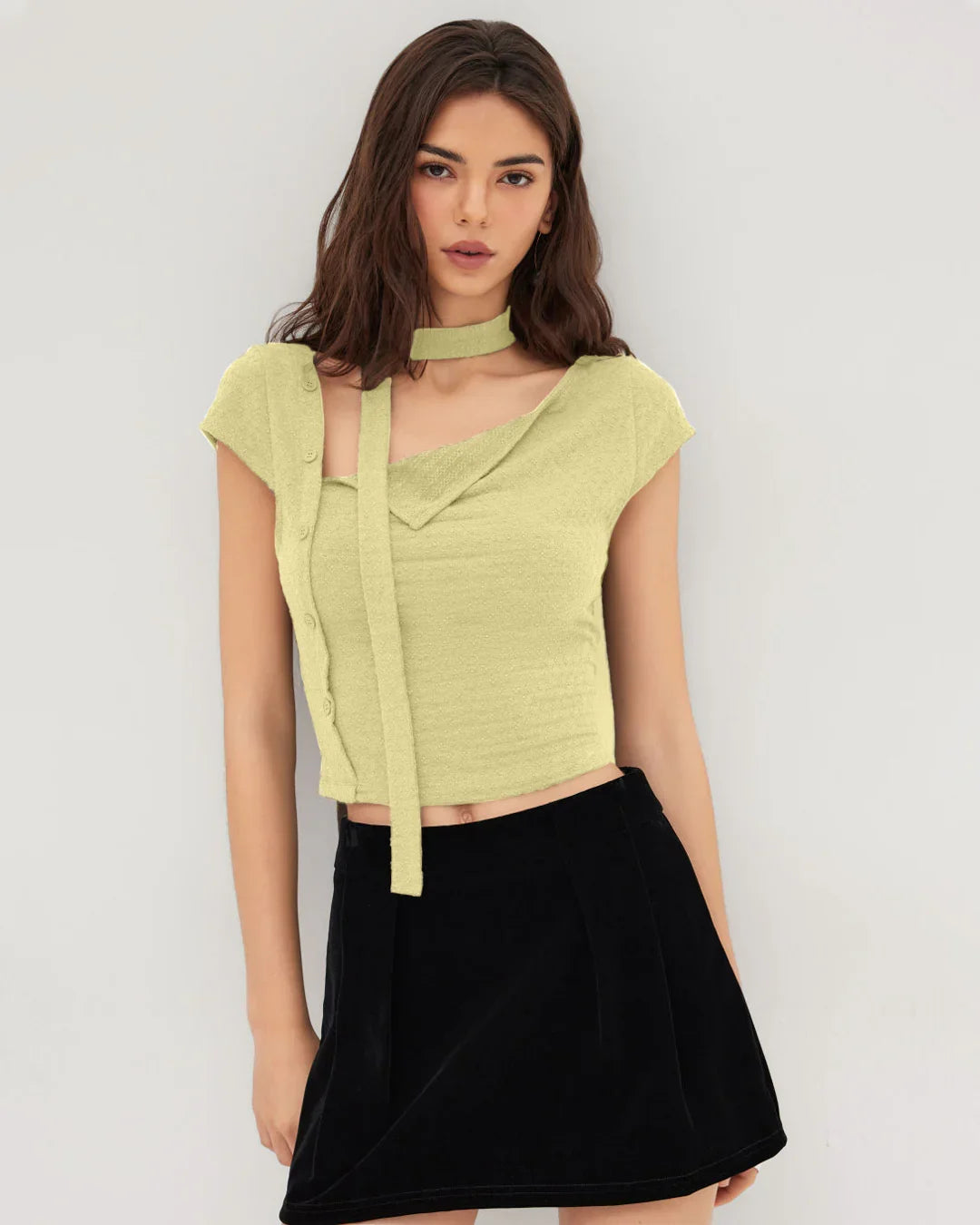 Asymmetrical Neck Texture Button Up Top With Scarf in French Vanilla brings a soft statement vibe with a modern twist. This asymmetrical neck top features a unique angled neckline paired with subtle texture detailing that instantly elevates the look. The button-up front adds structure, while the attached scarf detail gives it that extra styling edge without feeling overdone. Designed in a flattering cropped length, this asymmetrical neck top balances bold design with everyday wearability.