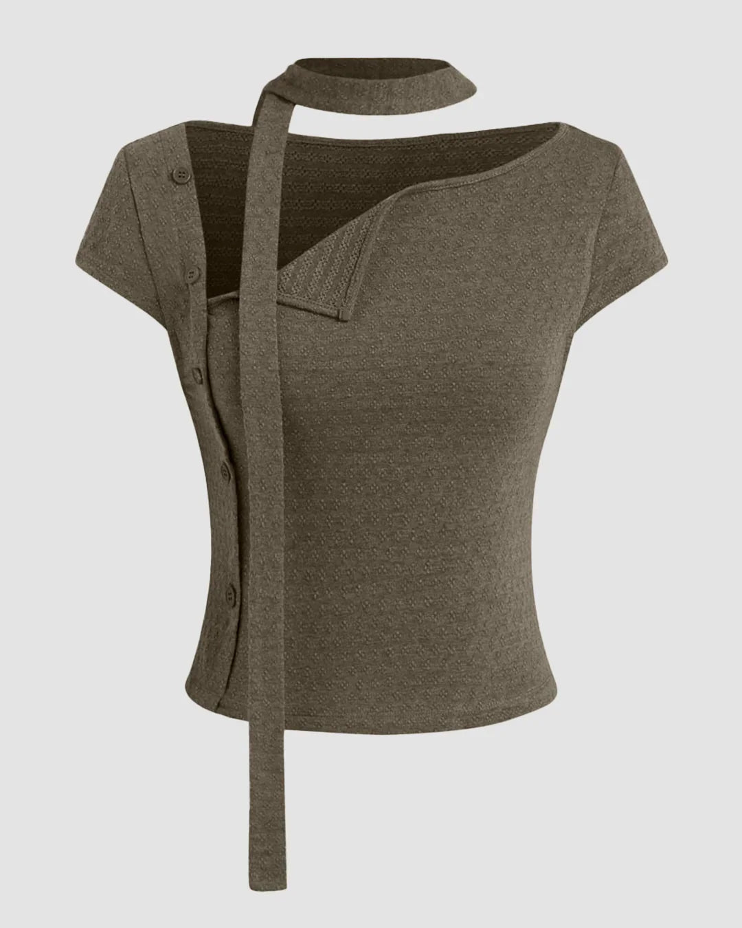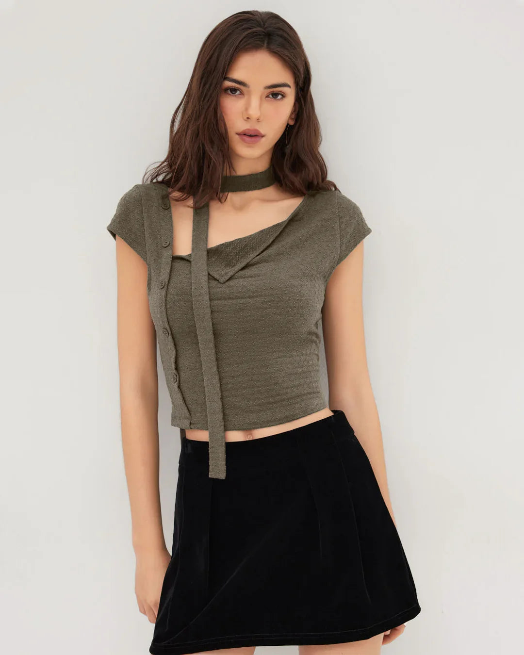 Asymmetrical Neck Texture Button Up Top With Scarf in Smoke Green brings a soft statement vibe with a modern twist. This asymmetrical neck top features a unique angled neckline paired with subtle texture detailing that instantly elevates the look. The button-up front adds structure, while the attached scarf detail gives it that extra styling edge without feeling overdone. Designed in a flattering cropped length, this asymmetrical neck top balances bold design with everyday wearability.
