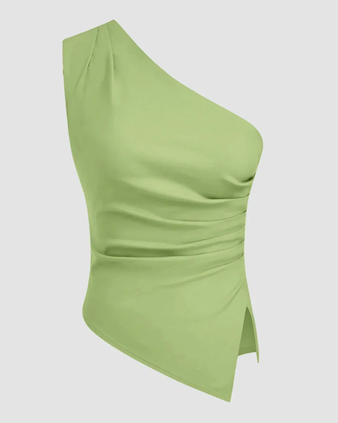 This light green top womens style brings a fresh and modern vibe to your wardrobe. Designed with a sleek asymmetrical neckline and flattering ruched detail, it adds instant shape to your look. The soft light pista tone keeps it subtle yet eye-catching. This light green top womens piece features a fitted silhouette that enhances your curves while staying comfortable. The smooth fabric drapes naturally, making this light green top womens option perfect for statement styling without feeling overdone.