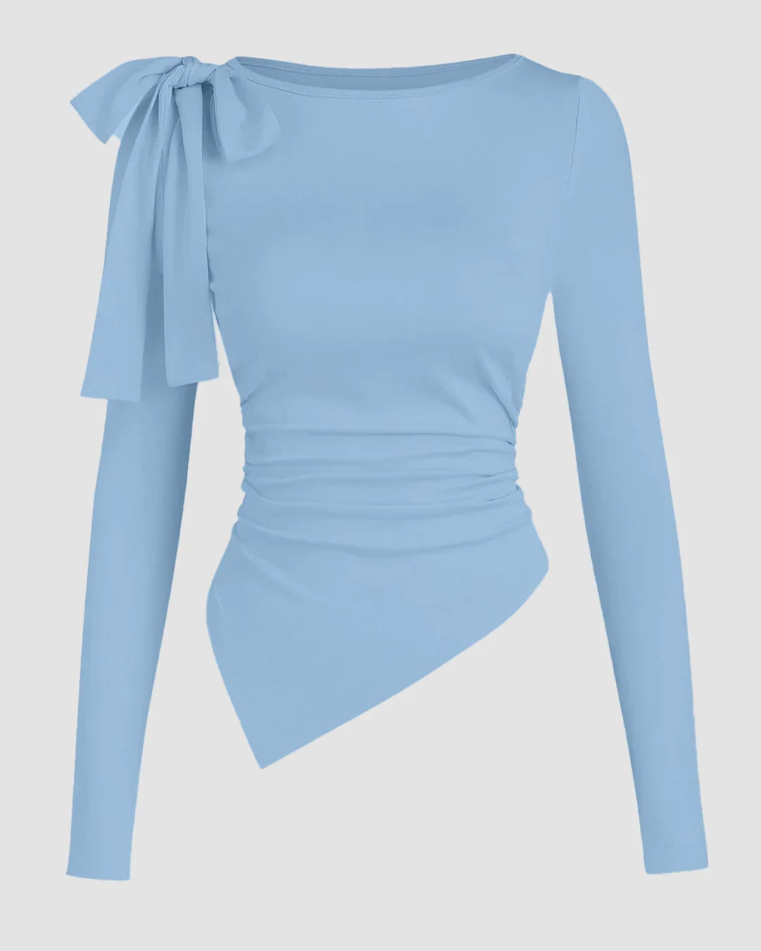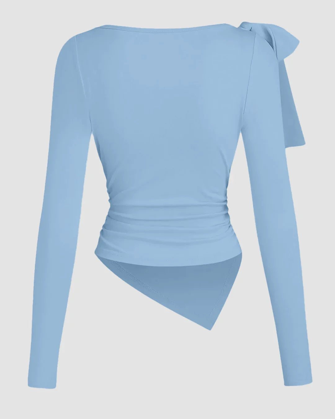 Boat Neck Bow-Shoulder Asymmetric Hem Full Sleeve Top in Blue