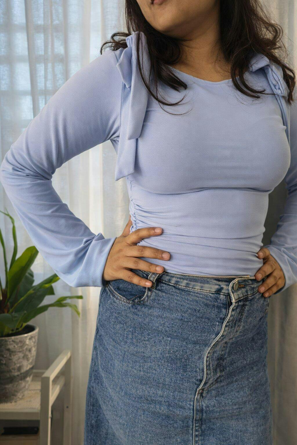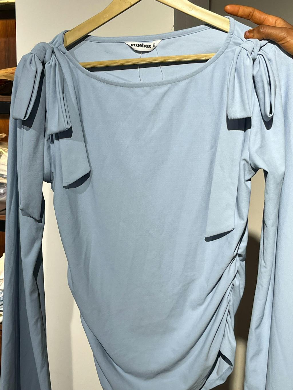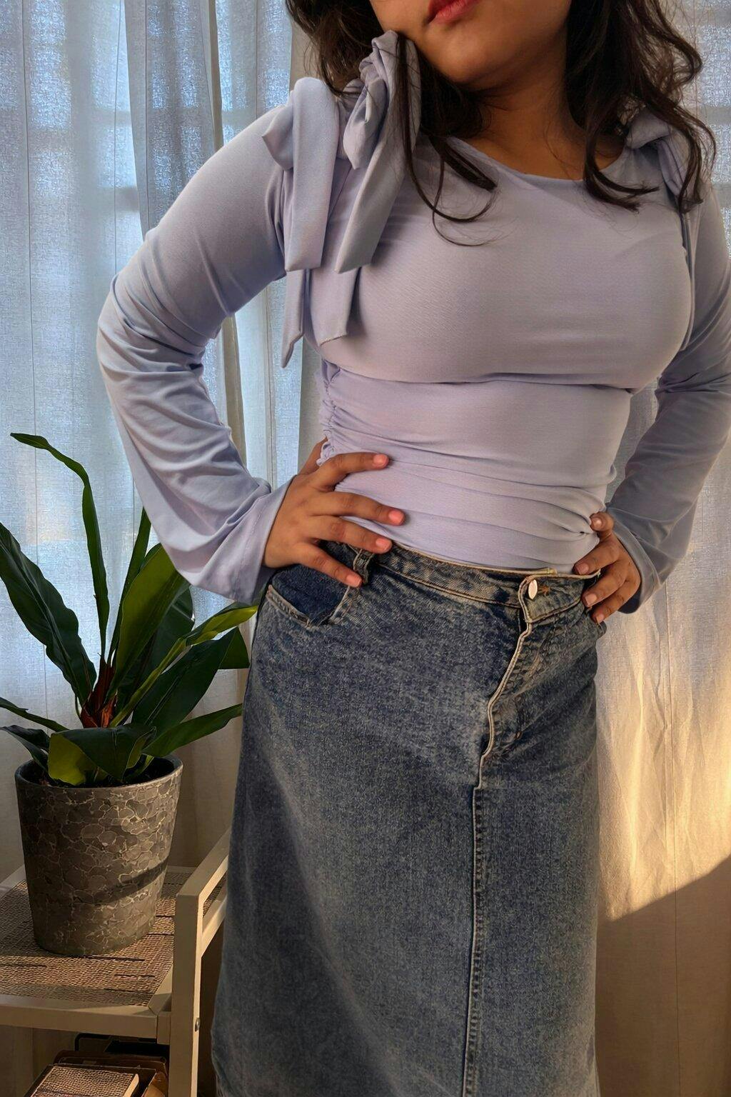 This bow tops for women style brings a soft, feminine look with a clean, modern shape. Designed with a wide neckline and statement bow ties at the shoulders, it adds a playful touch while keeping the fit neat and flattering. The fitted bodice hugs comfortably around the waist, and the gentle ruching through the midsection adds subtle texture without feeling bulky. Long flared sleeves balance the cropped length, giving the silhouette an easy flow. Finished in a calm blue tone, this bow tops for women piece feels fresh, stylish, and easy to wear. Crafted in a smooth stretch blend, it stays comfortable and flexible through long hours.