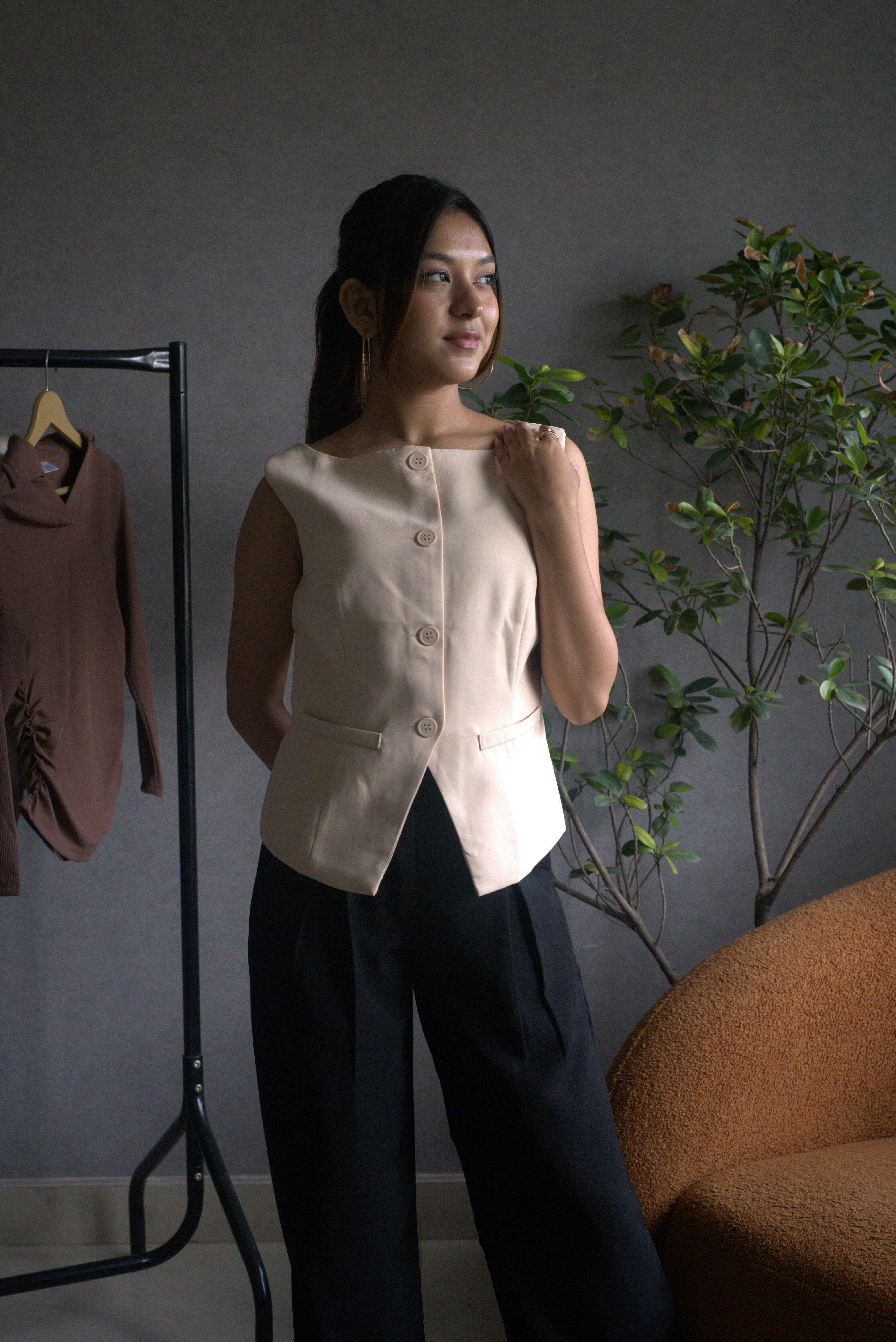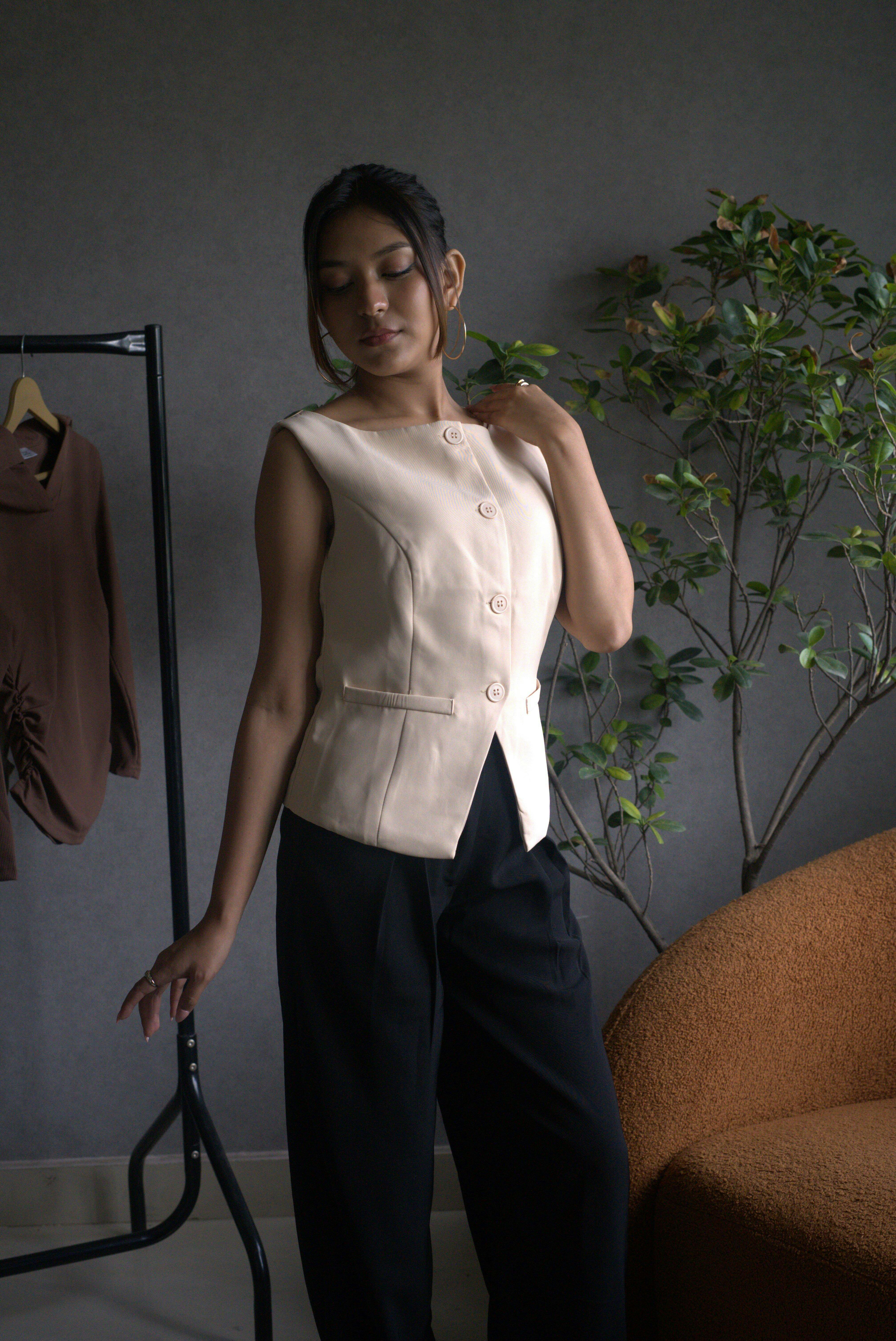 Introducing our Boat Neck Front Button Beige Vest Jacket Top. This jacket top brings clean tailoring and structured grace to your everyday fits. With its sculpted silhouette and sharp hemline slit, it’s the kind of layer that works harder than your average vest. Whether you’re dressing for a casual outing or something a bit more elevated, this jacket top is your go-to for an effortlessly put-together vibe.