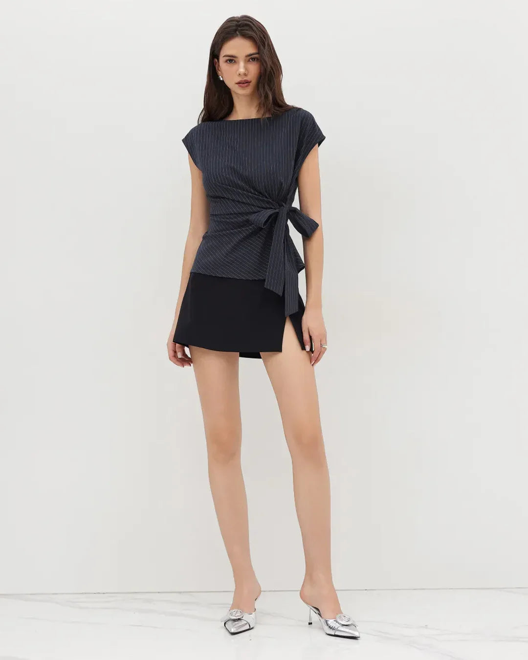 This knot front top blends minimal stripes with a flattering wrap detail. Designed with a soft boat neckline and cap sleeves, it creates a balanced and elegant silhouette. The side knot adds shape at the waist, giving this knot front top a naturally defined fit. The subtle navy stripes keep the look polished yet relaxed. This knot front top feels lightweight and smooth, making it perfect for easy everyday styling.