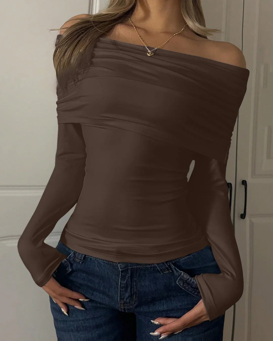 Brown Off-Shoulder Ruched Long Sleeve Fitted Casual Knit Top brings soft drama and everyday comfort together. Designed with an off-shoulder neckline and all-over ruching, this piece hugs the body in the right places while keeping the look relaxed and wearable. The knit fabric has a smooth, stretchy feel that moves easily with you, making it perfect for long hours without feeling tight. With its fitted silhouette and clean finish, this long sleeve top adds a subtle statement to your casual wardrobe without trying too hard.
