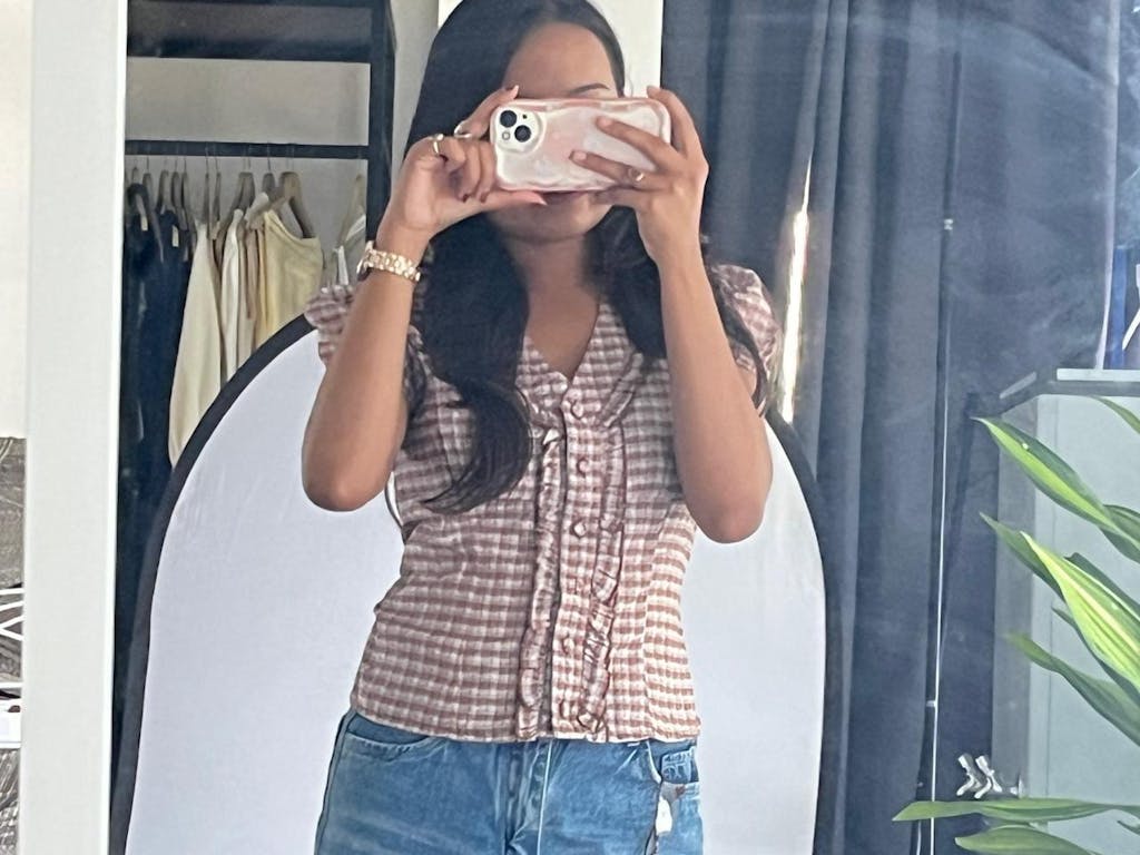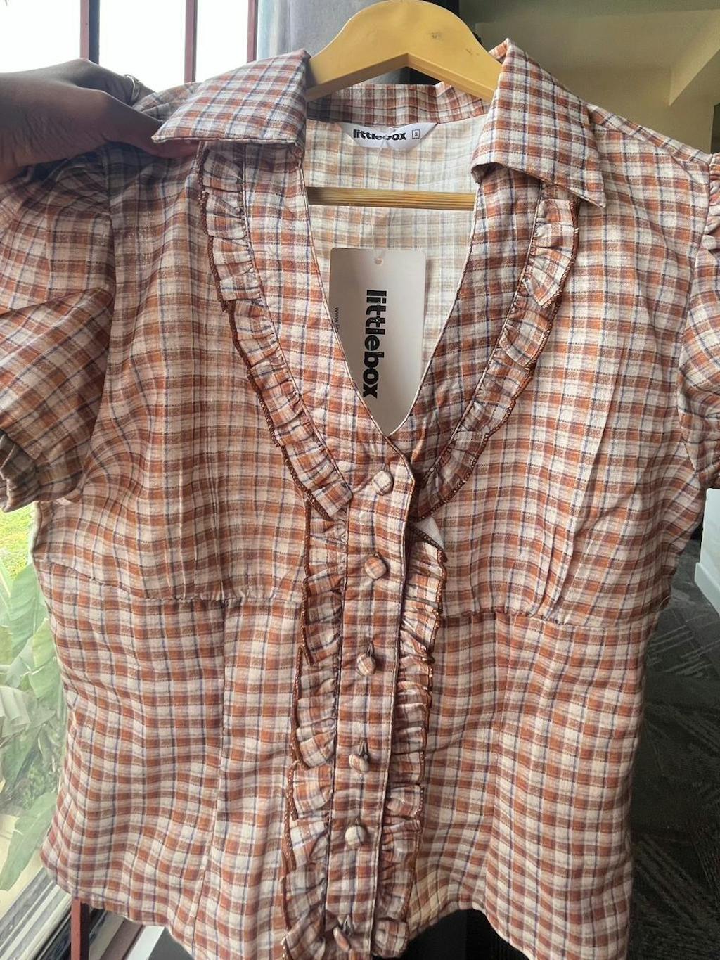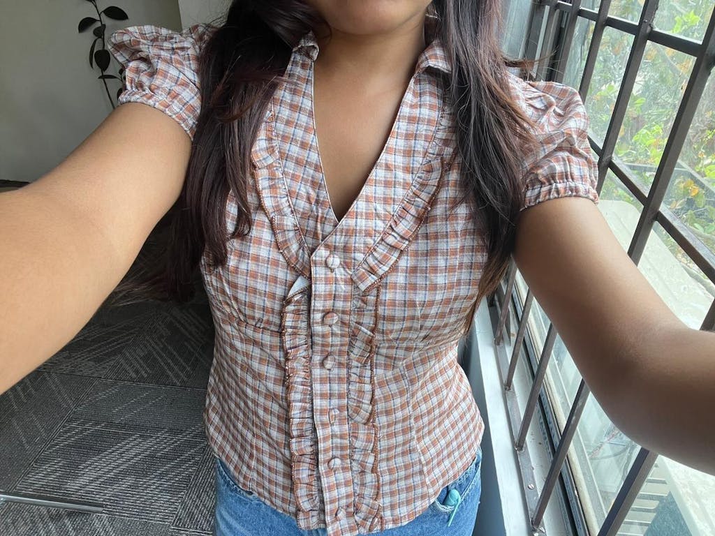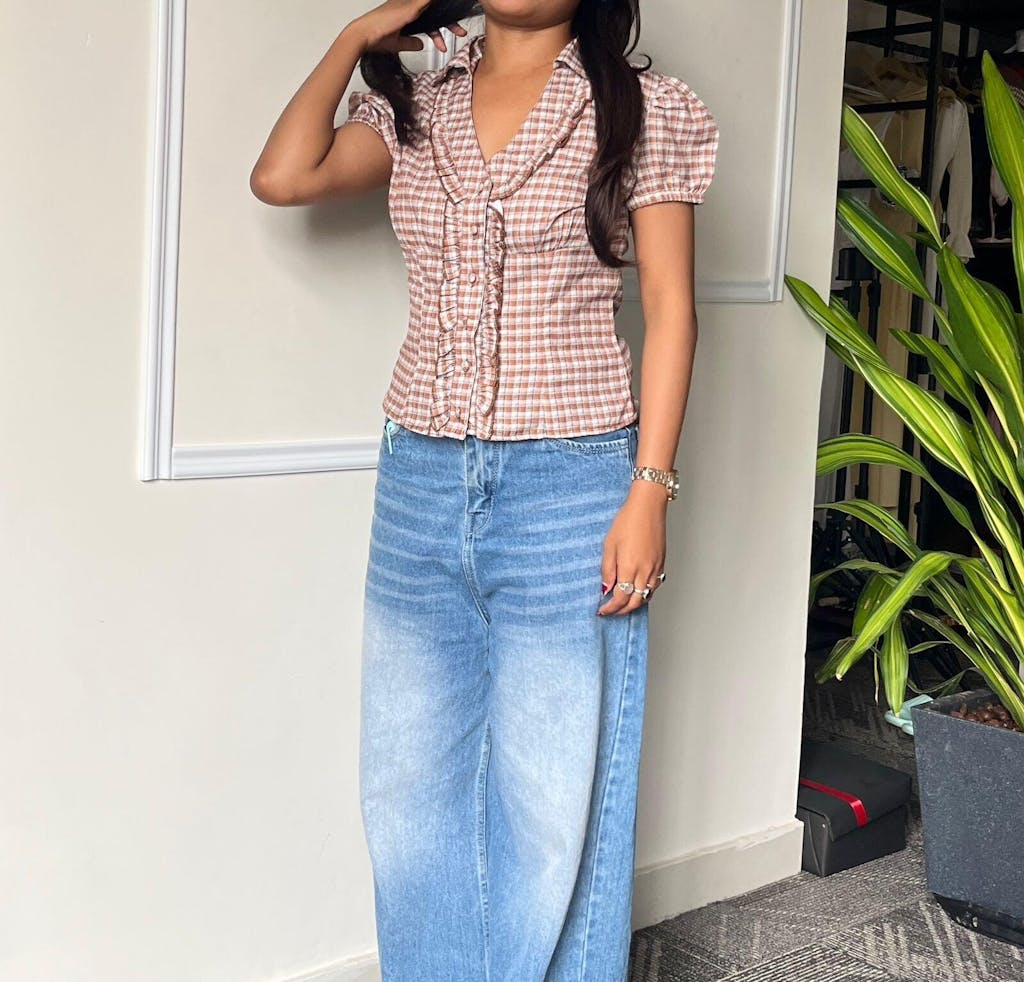 This checkered top brings a cute, vintage-inspired vibe with its fitted shape and soft detailing. Designed with a collared neckline and front ruffle placket, it adds texture without feeling overdone. The brown check pattern gives it a warm, everyday look, while the cropped length keeps the style modern. This checkered top sits neatly on the body and feels light, easy, and wearable.