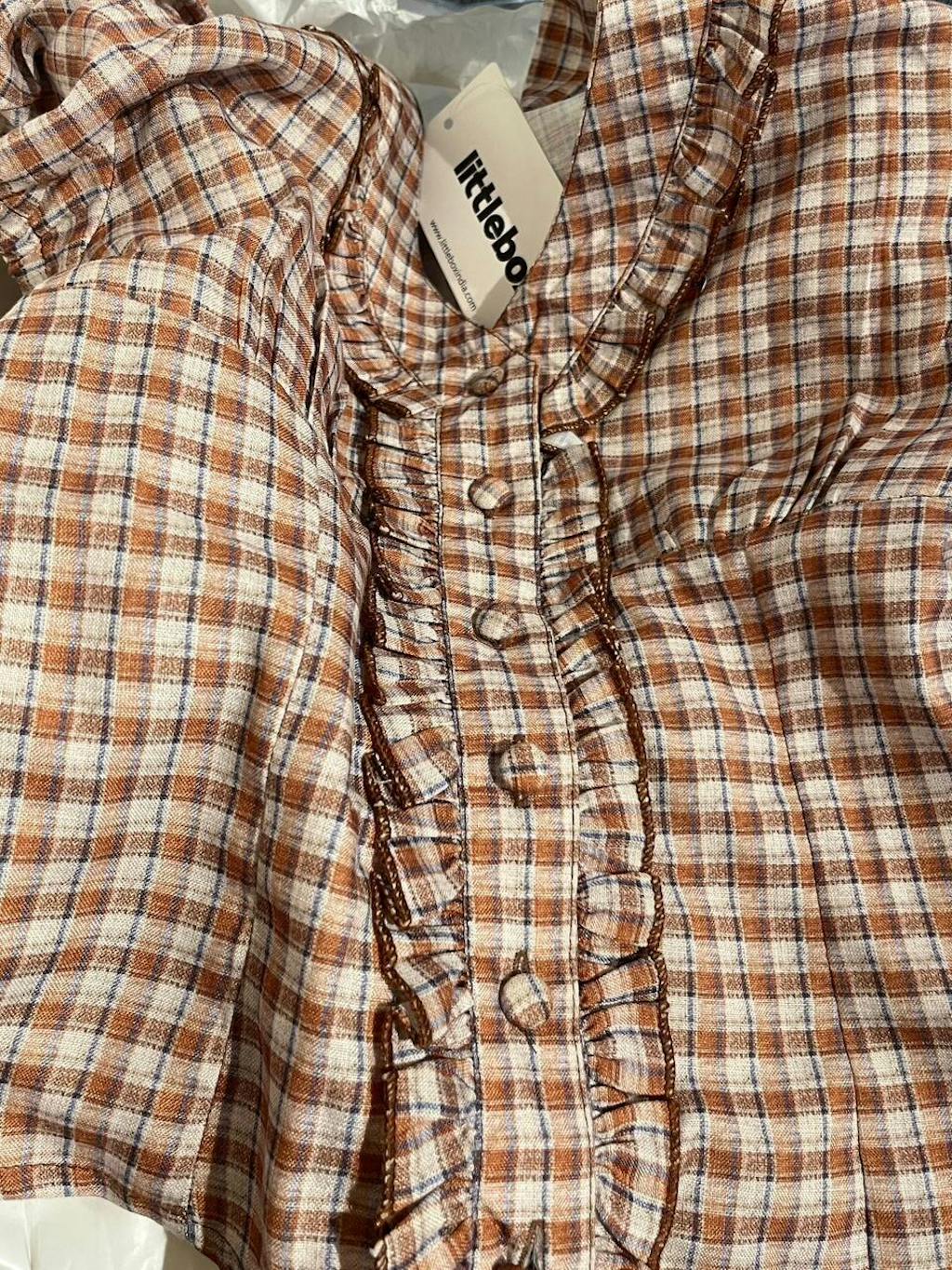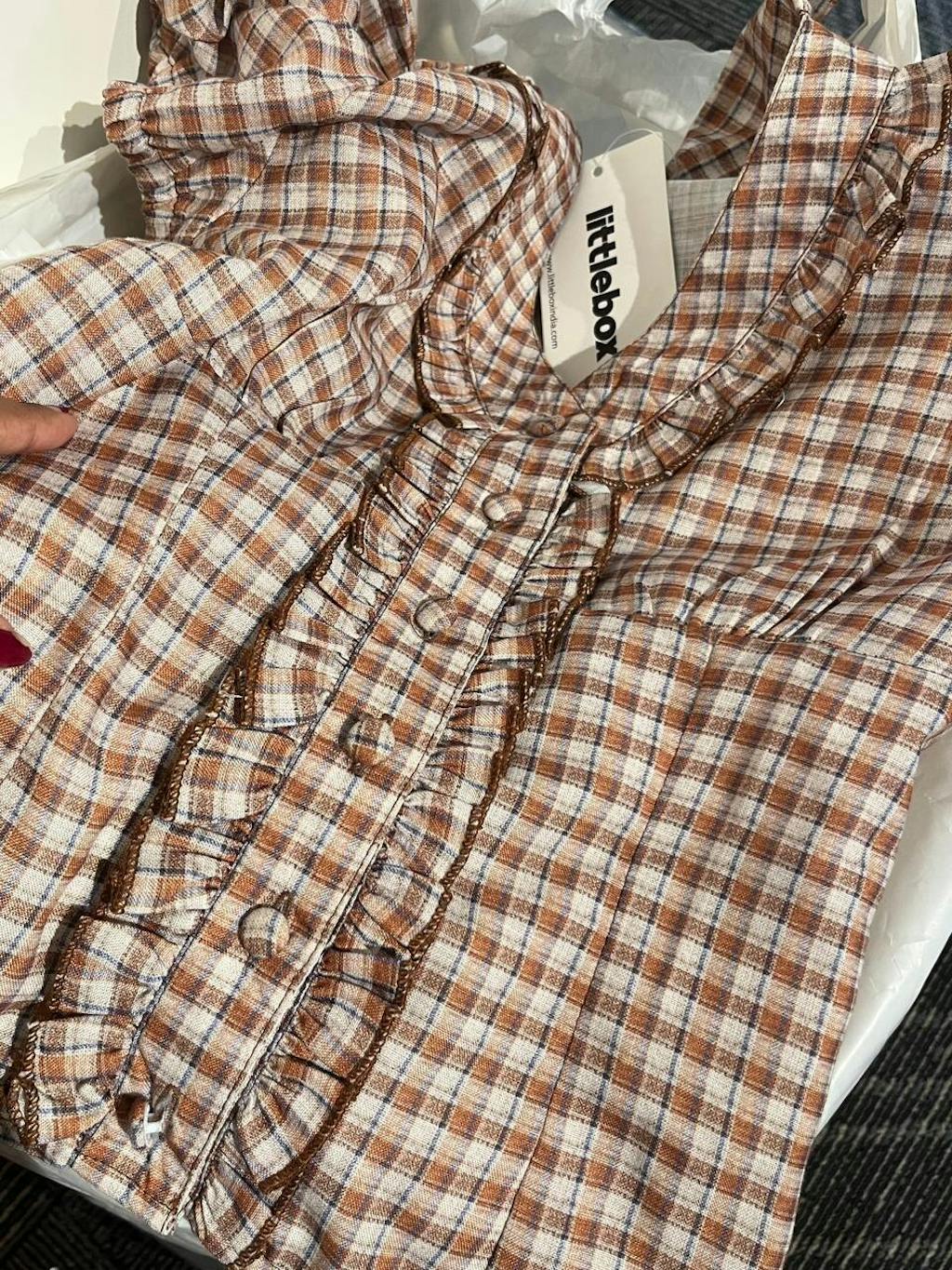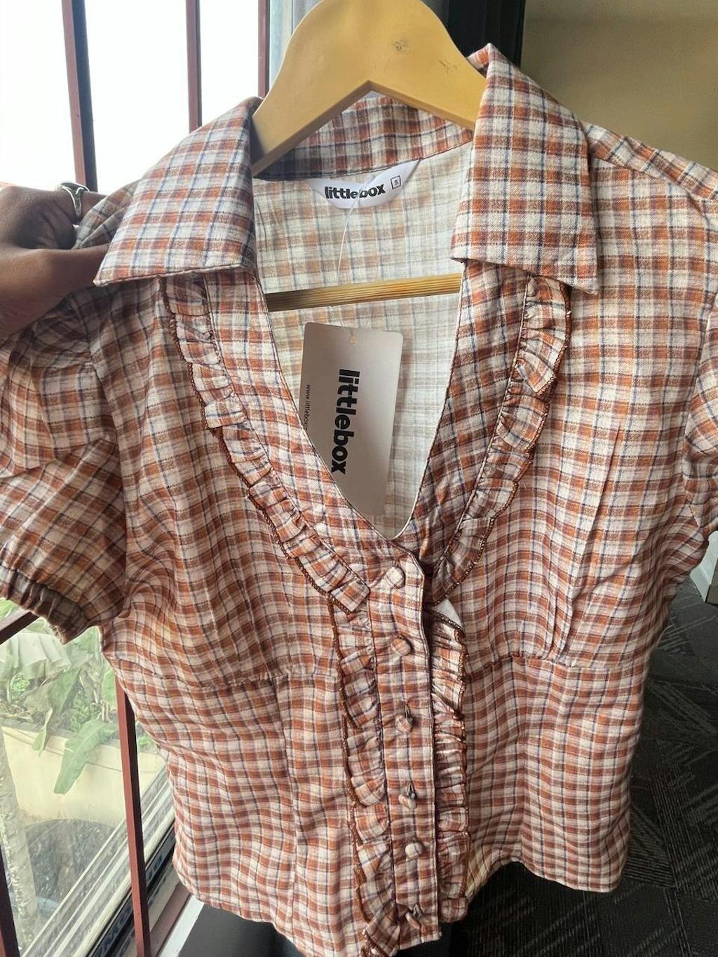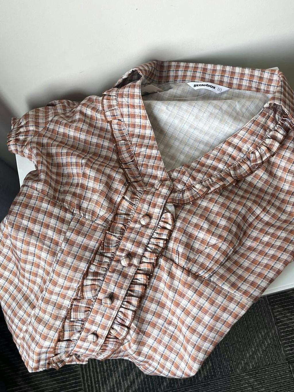 This checkered top brings a cute, vintage-inspired vibe with its fitted shape and soft detailing. Designed with a collared neckline and front ruffle placket, it adds texture without feeling overdone. The brown check pattern gives it a warm, everyday look, while the cropped length keeps the style modern. This checkered top sits neatly on the body and feels light, easy, and wearable.