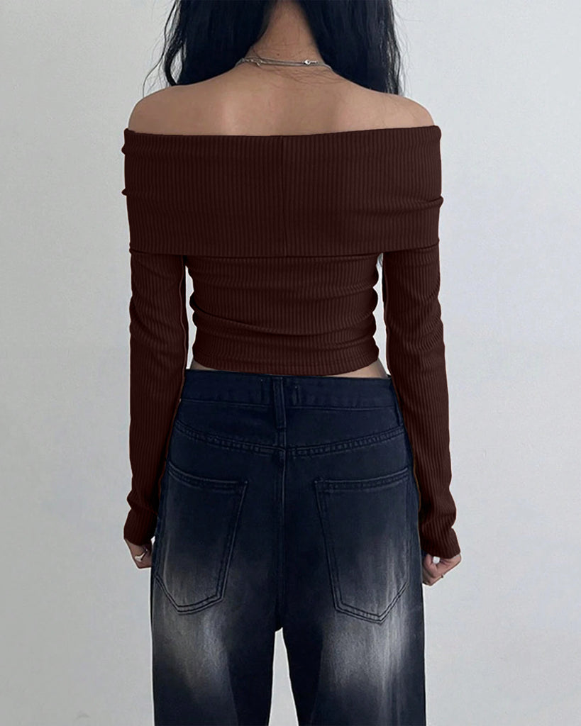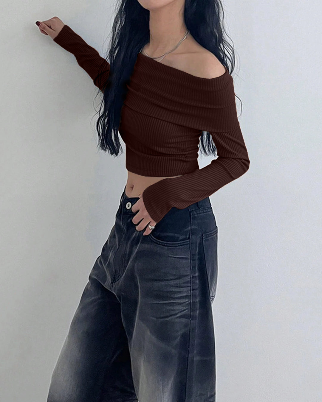 Chocolate Fondae Ribbed Off-Shoulder Full Sleeve Fitted Crop Top