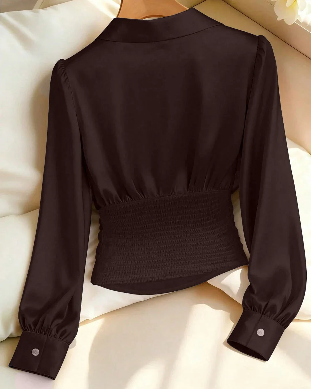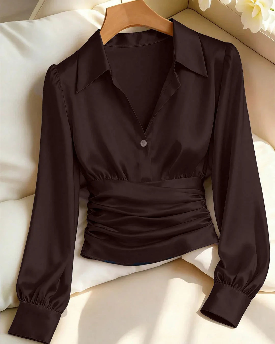Coffee Solid Color Satin Long Sleeve Collared Waist top is designed to give a clean, polished look with a soft, fluid feel. The satin finish adds a subtle sheen that instantly elevates the outfit, while the collared neckline keeps it sharp and versatile. With its gently cinched waist, this long sleeve collared shirt creates a flattering shape without feeling restrictive, making it perfect for both workdays and styled evenings.