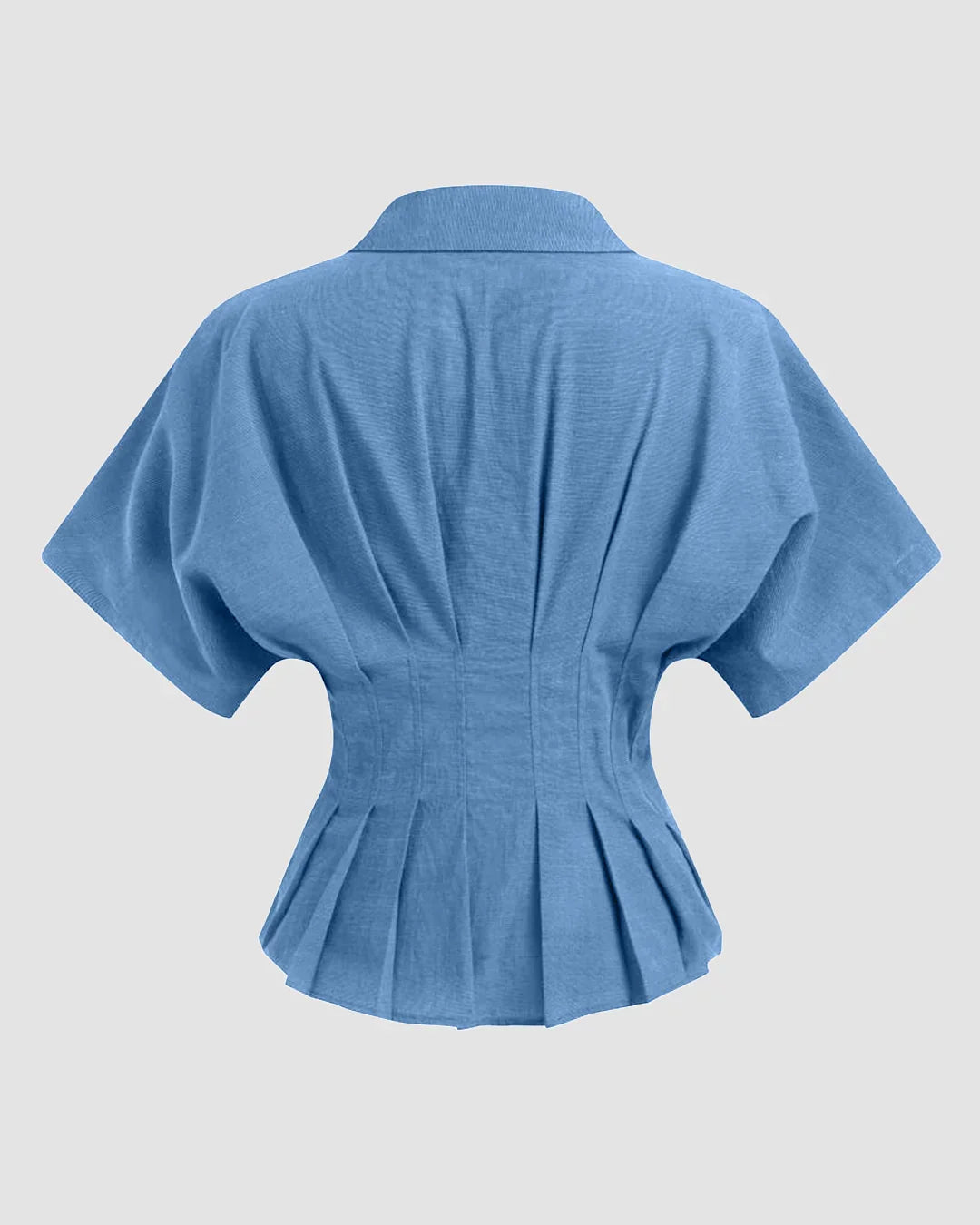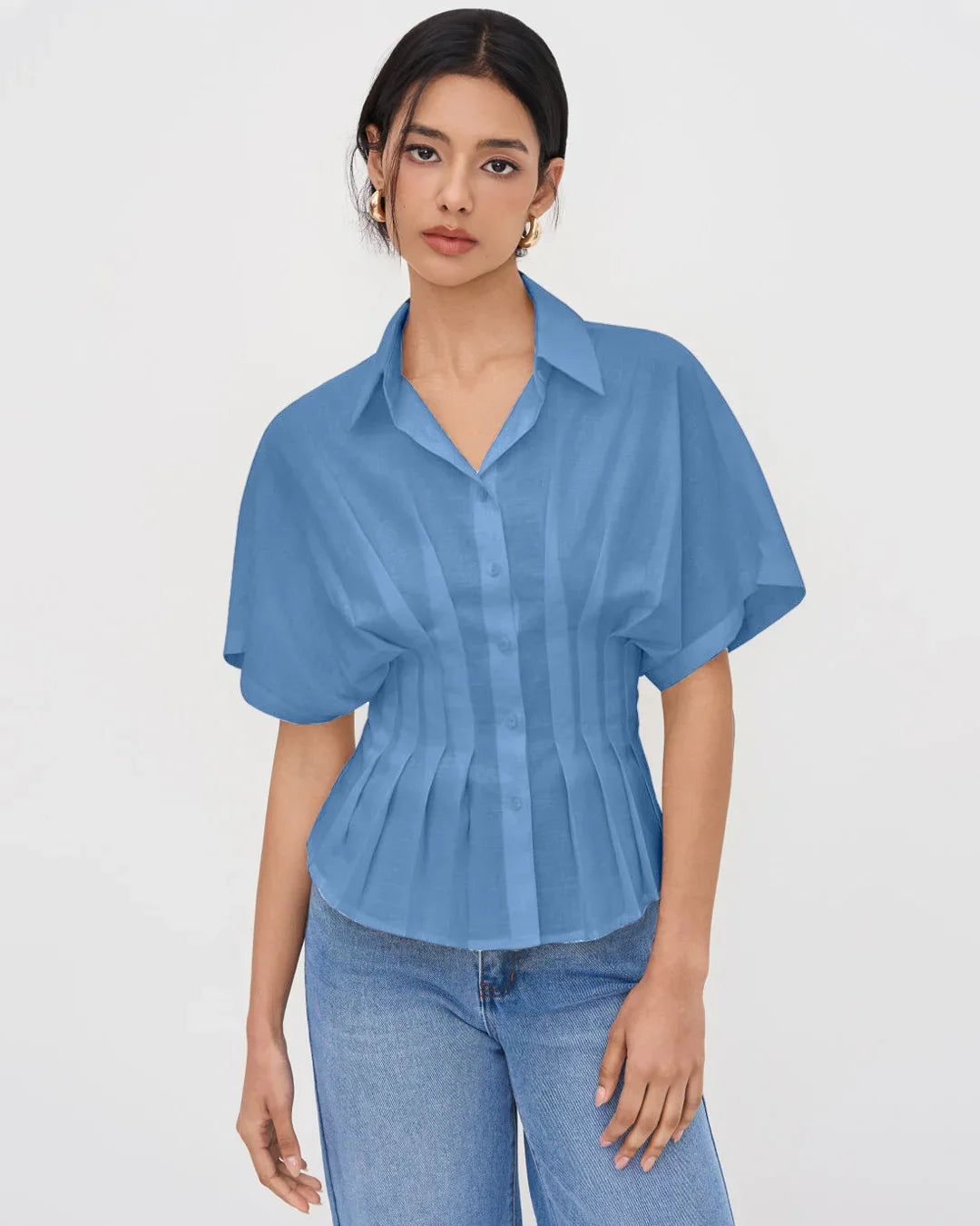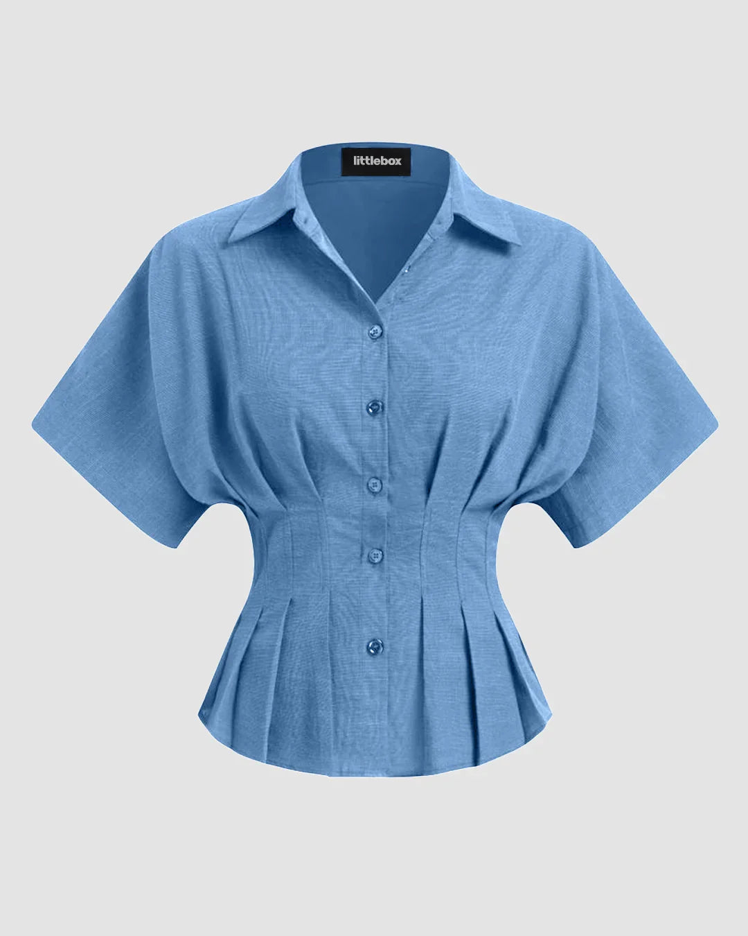 Collar V-neck Pleated Short Sleeve Shirt in Light Blue