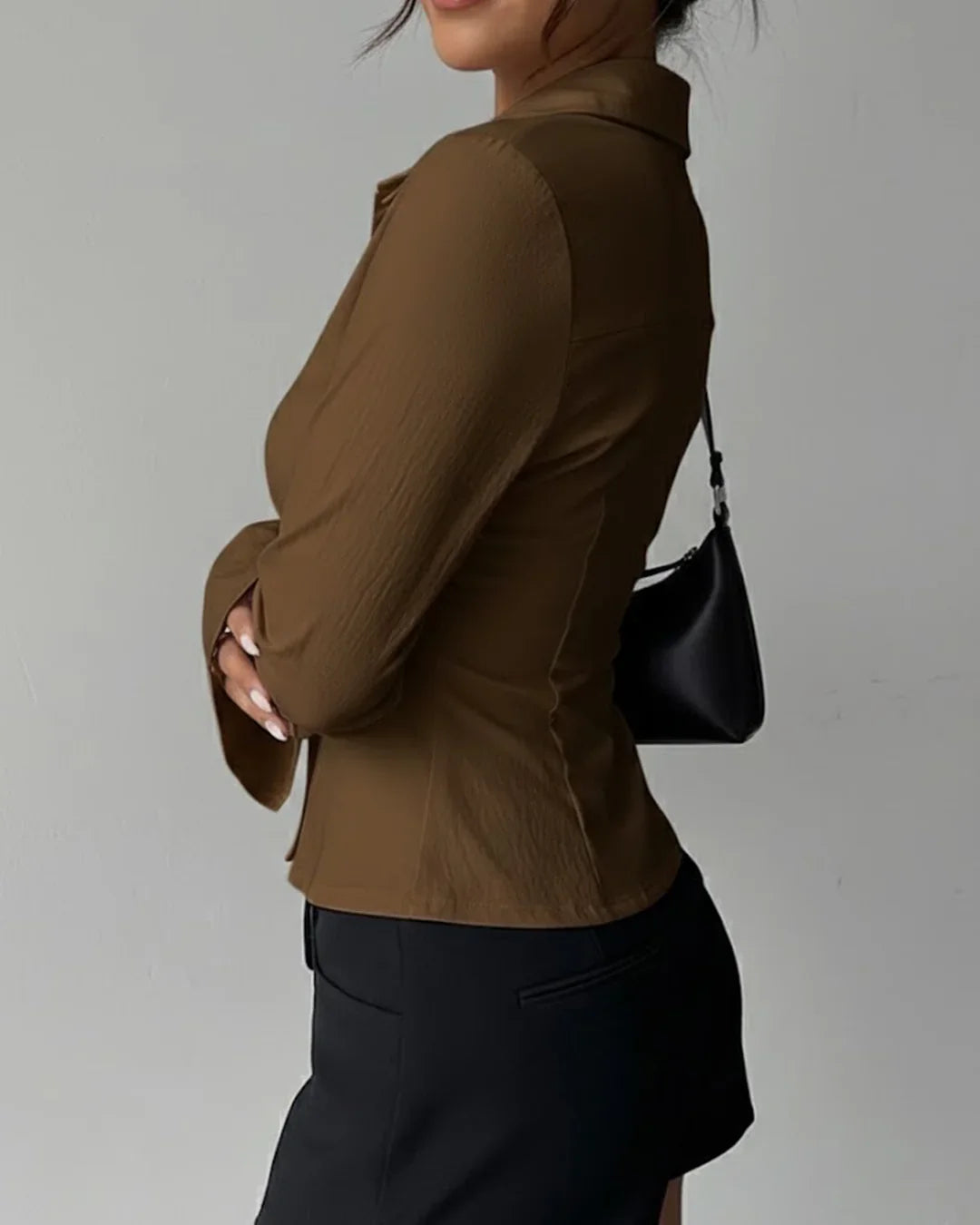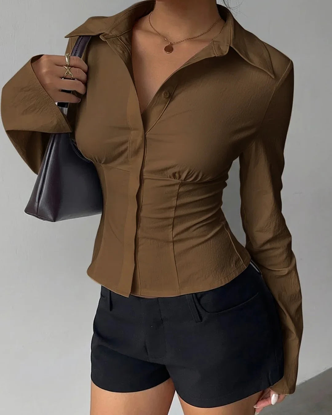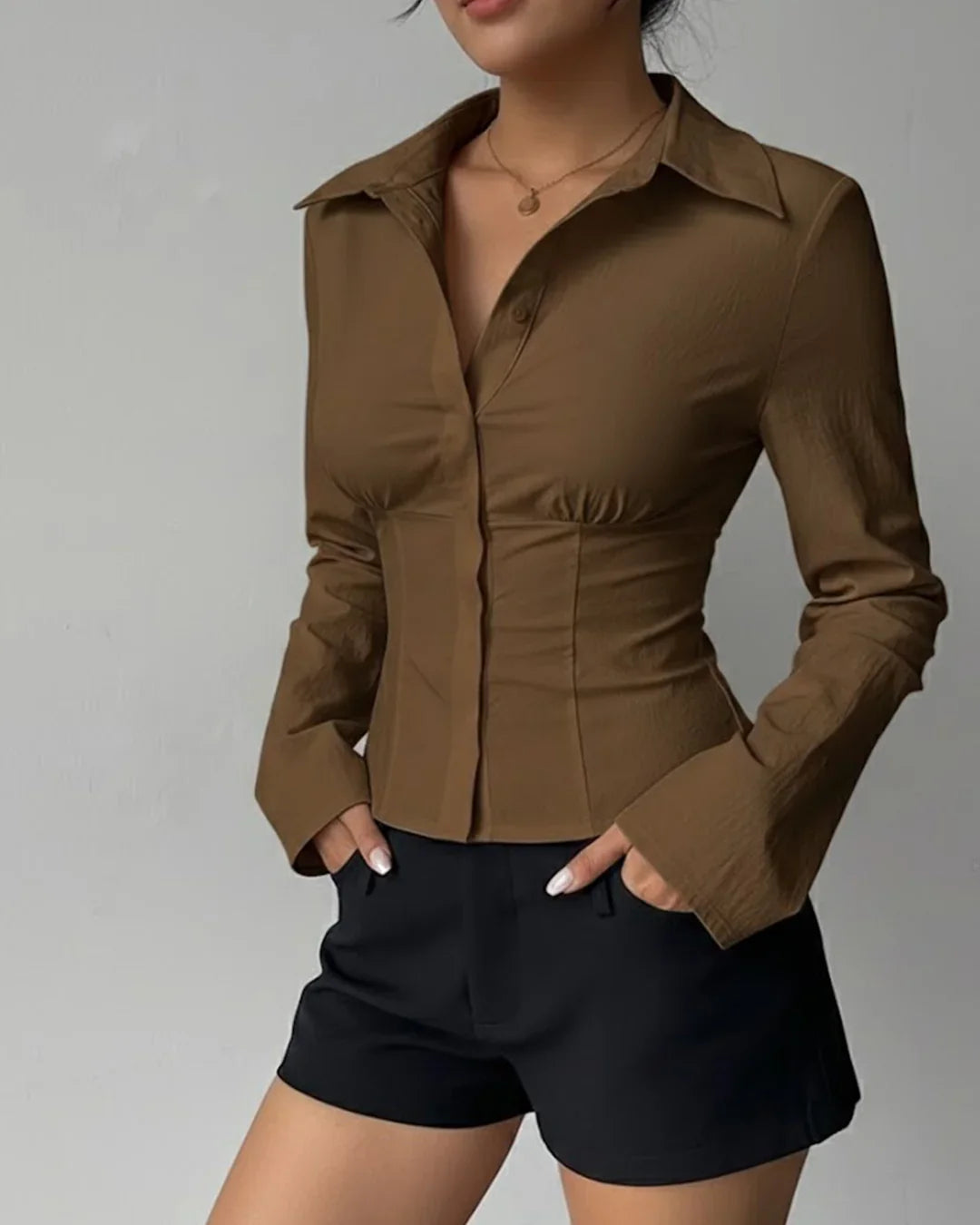 Collared V-Neck Slim Fit Straight Hem Ruched Waist Top in Brown