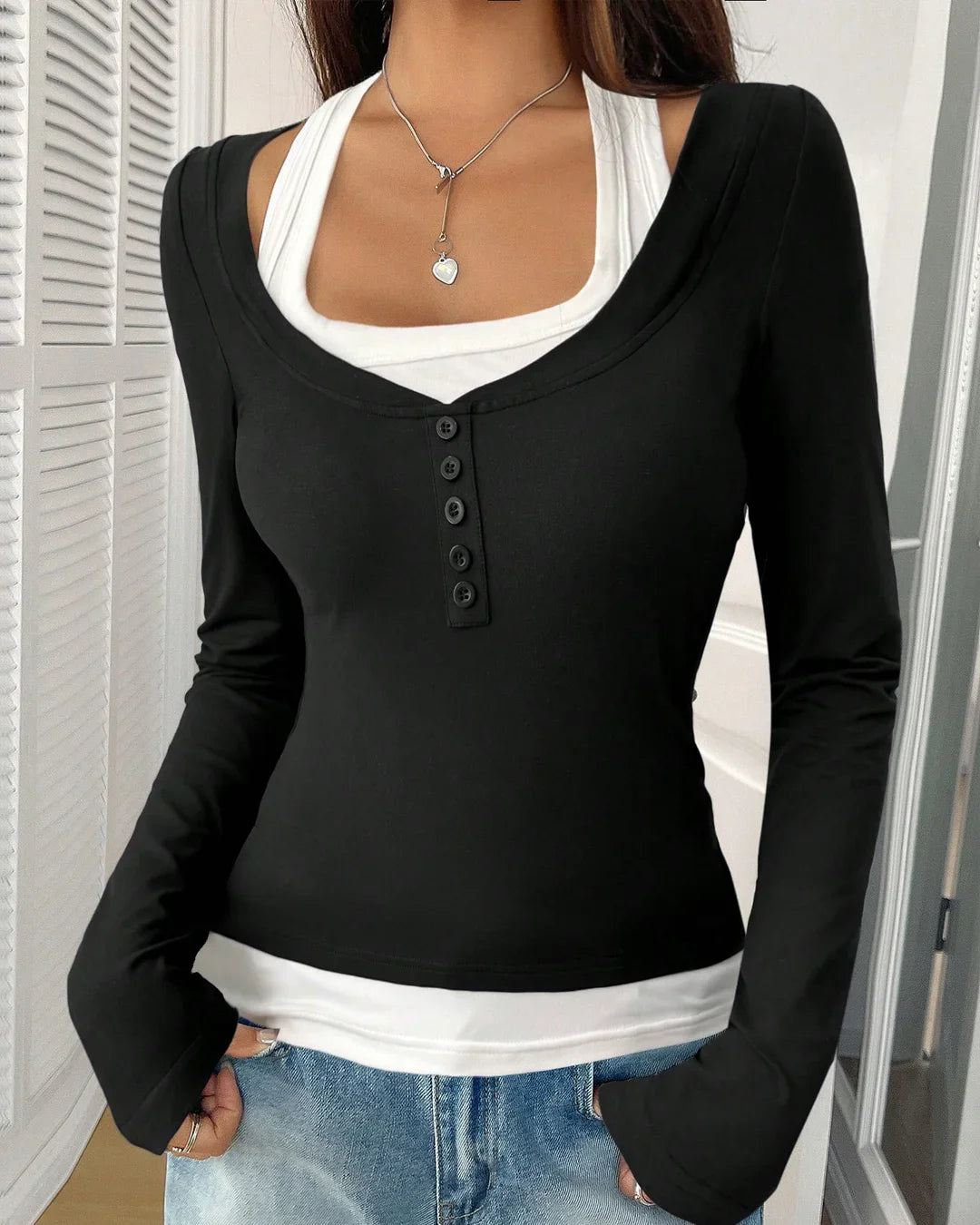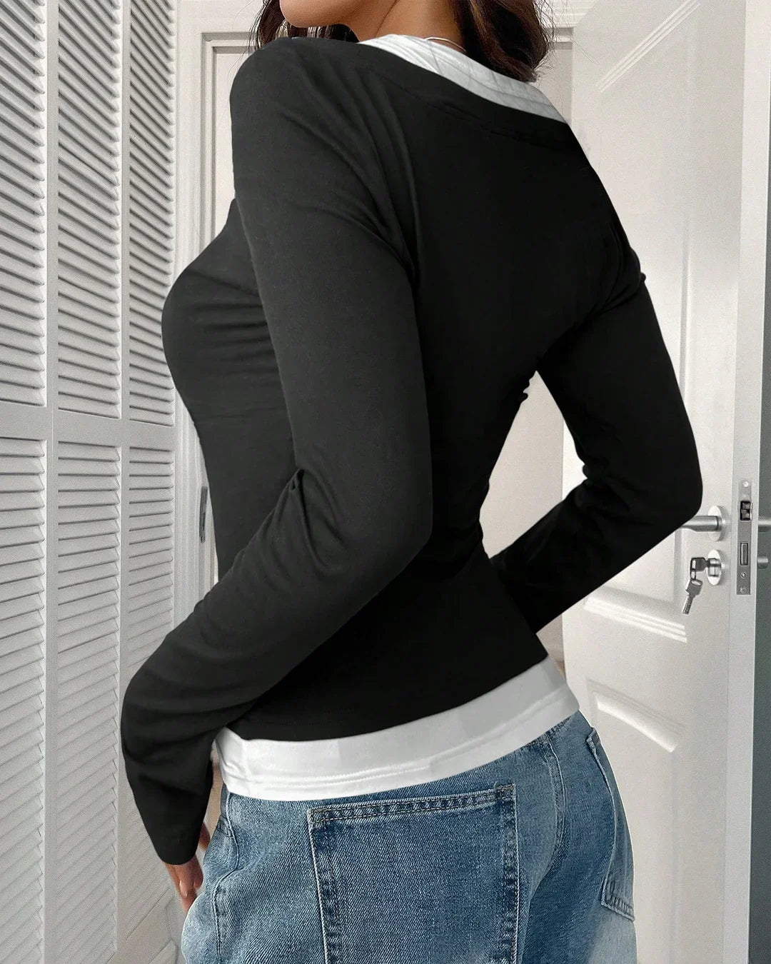 Contrast Layered Style Long Sleeve Button-Front Casual Top