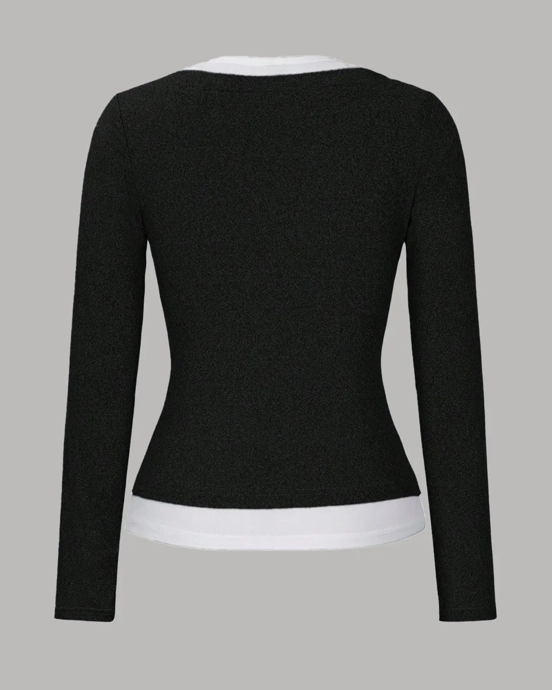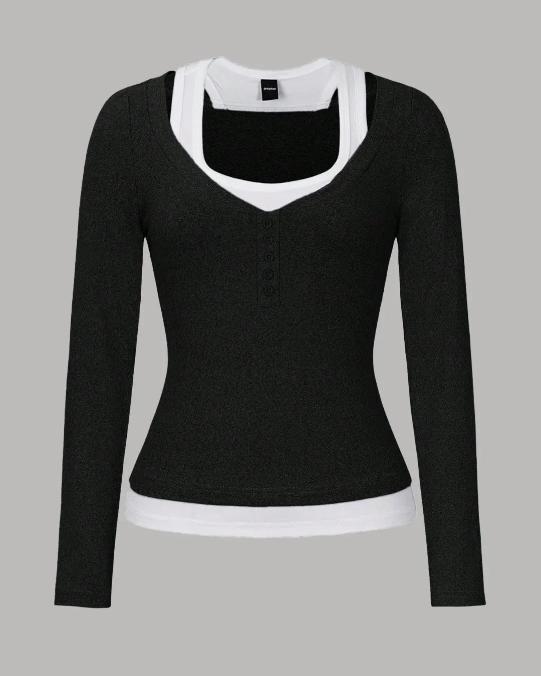 Contrast Layered Style Long Sleeve Button-Front Casual Top is that everyday essential with a little extra detail. Designed to look like a layered outfit in one easy piece, it features a fitted black outer top with a contrasting white inner layer peeking through the neckline and hem. The button-front detail adds a casual, lived-in vibe, while the soft cotton blend fabric keeps it breathable and comfy for all-day wear. Easy to move in and easy to style, this long sleeve top is perfect for low-effort outfits that still look put together.