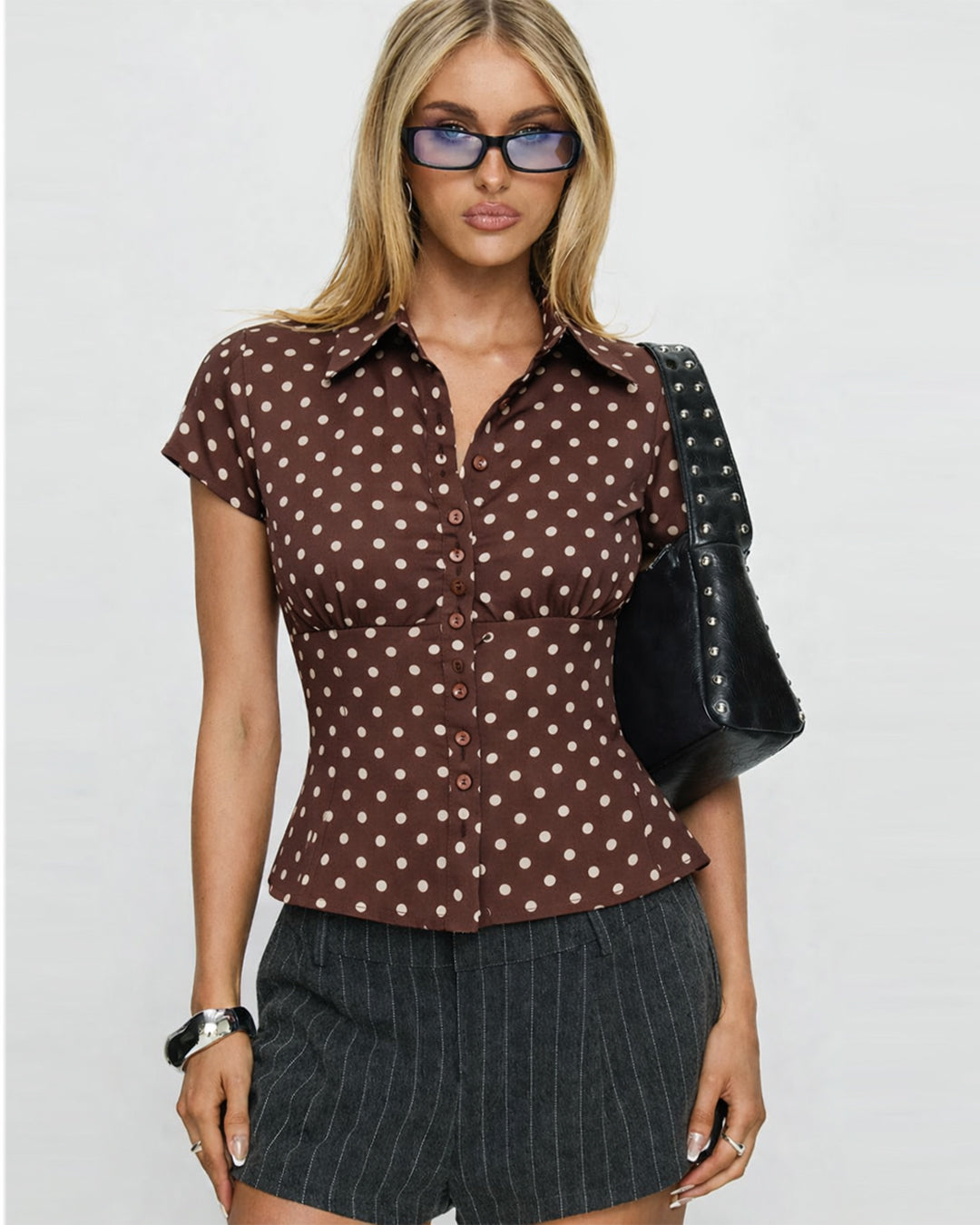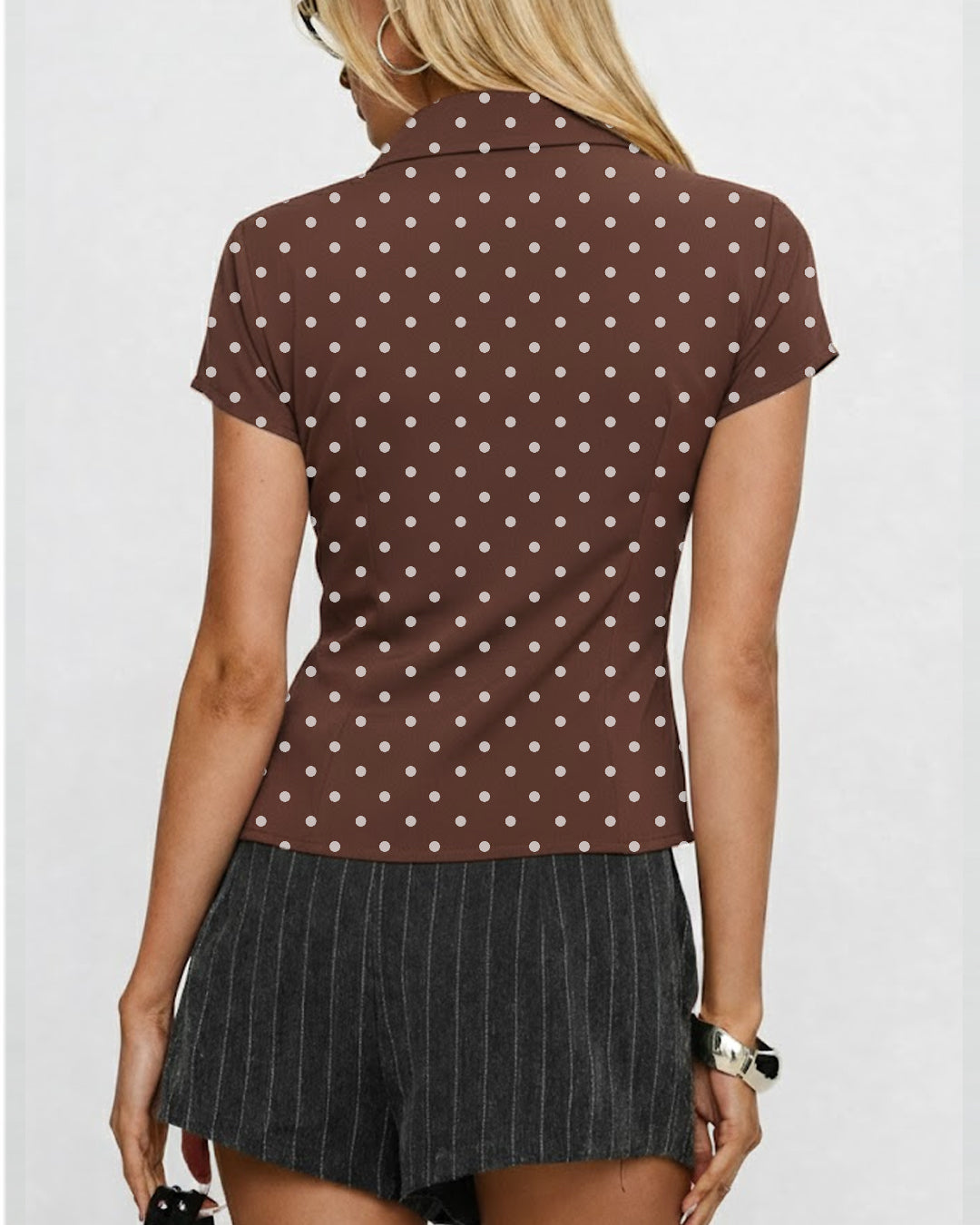 Cottesloe Polka Dot Top in Brown brings a soft vintage vibe with a clean, modern fit. Designed with a flattering slim shape and classic polka dot print, this top feels playful yet polished. The button-down front and subtle collar detail add structure, while the smooth fabric keeps it light and easy to wear. Cottesloe Polka Dot Top in Beige hugs gently at the waist, creating a flattering silhouette without feeling tight.