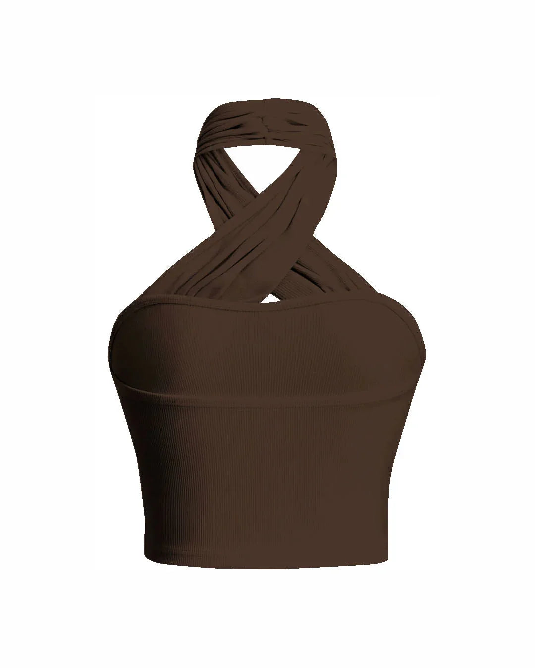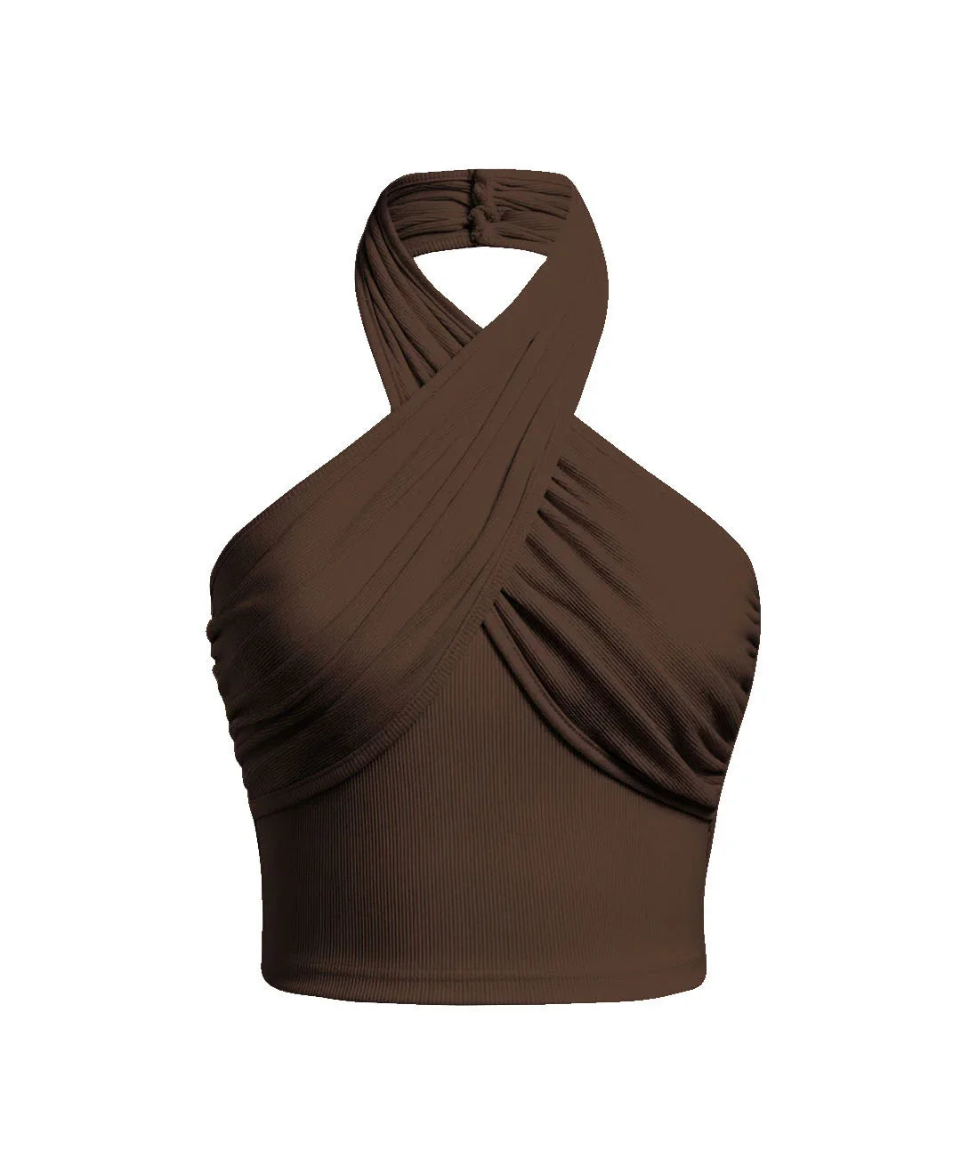 Cross-Folded Neckline Halter Backless Top in Chocolate Fondae