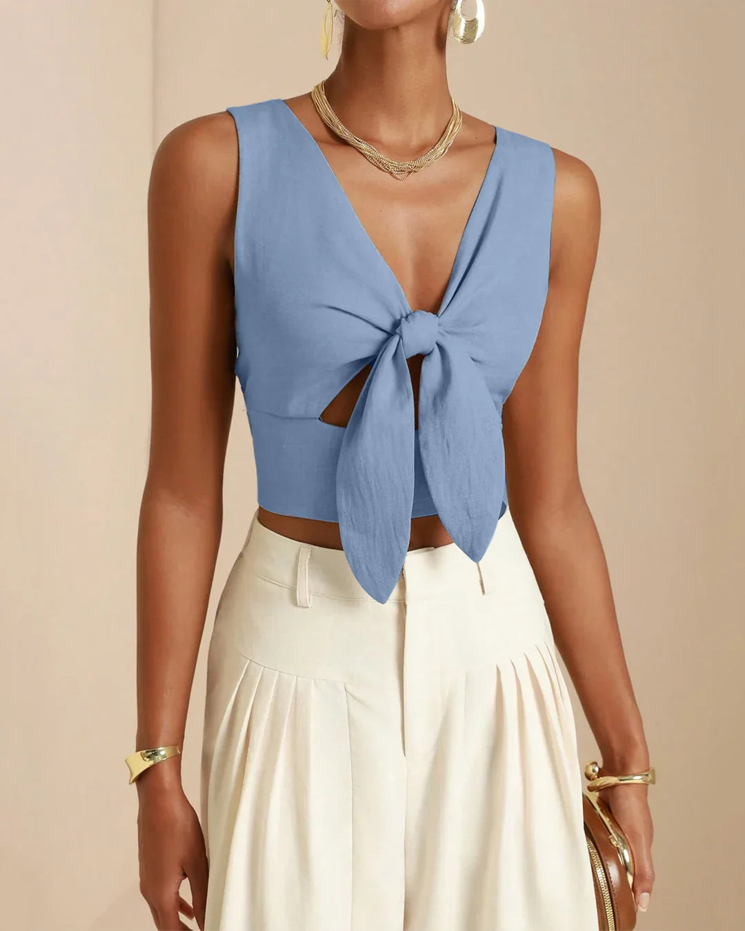 This cropped camisole top brings effortless charm with a flattering deep V neckline and statement front knot detail. Designed in a soft polyester and cotton blend, it feels light, breathable, and comfortable for all-day wear. The hollow-out front adds a subtle bold touch while still keeping the look minimal and classy.