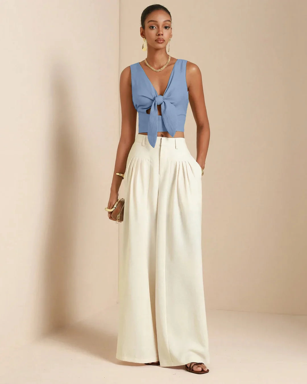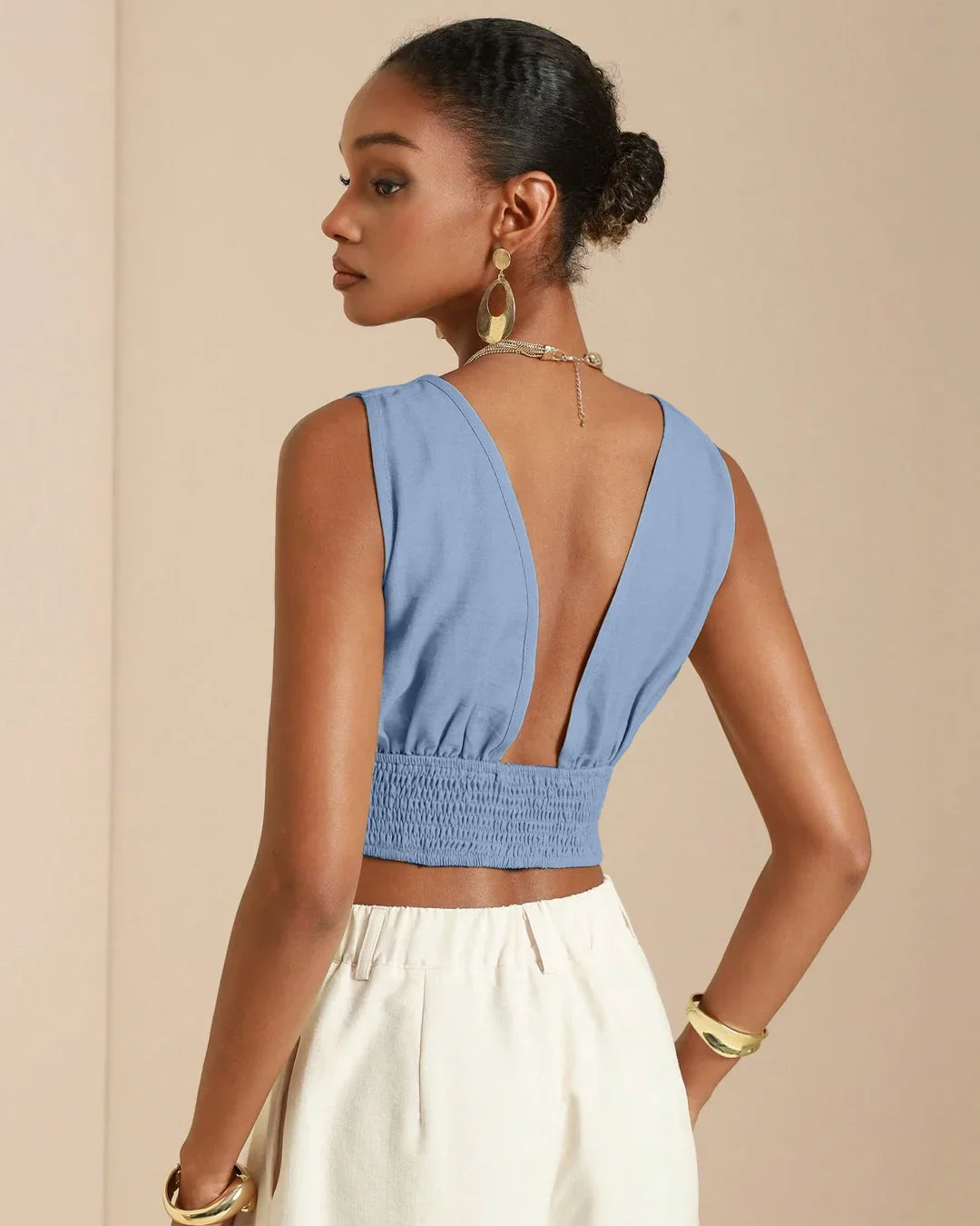 The sleeveless cut keeps it airy and easy to layer, while the cropped length pairs perfectly with high-waisted bottoms. The fabric has a soft texture that drapes naturally over the body, giving a relaxed yet polished finish. It’s the kind of piece that instantly elevates simple outfits without trying too hard.