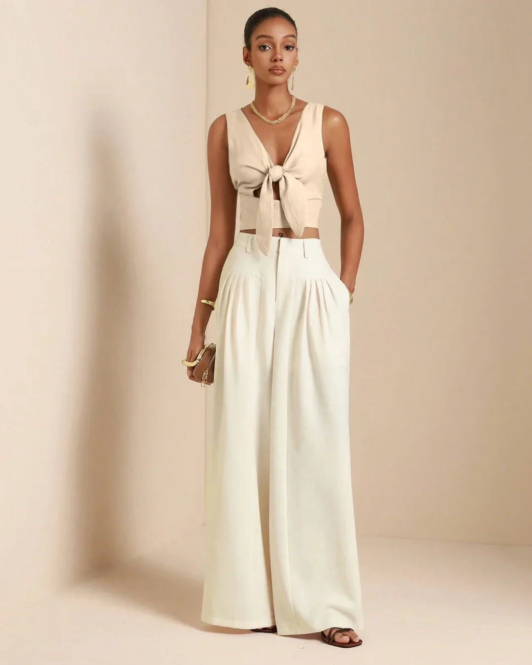 The sleeveless cut keeps it airy and easy to layer, while the cropped length pairs perfectly with high-waisted bottoms. The fabric has a soft texture that drapes naturally over the body, giving a relaxed yet polished finish. It’s the kind of piece that instantly elevates simple outfits without trying too hard.