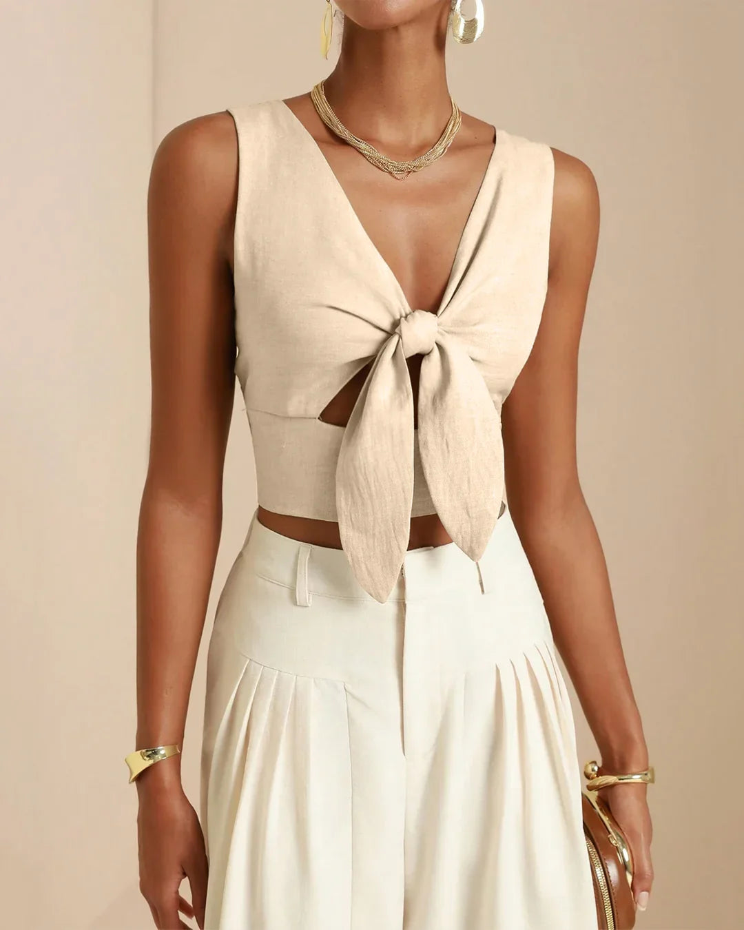 Deep V-Neck Knotted Hollow Out Cropped Camisole Top in Khadi