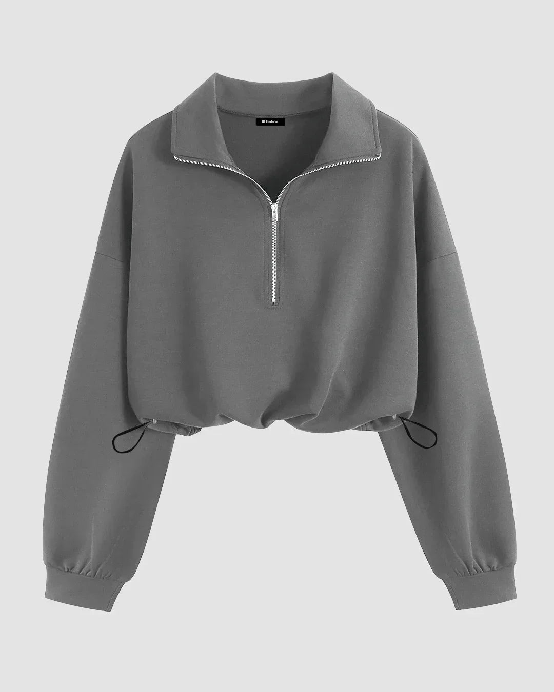 Drop Shoulder Long Sleeve Half Zip Drawstring Hem Sweatshirt in Black Mélange