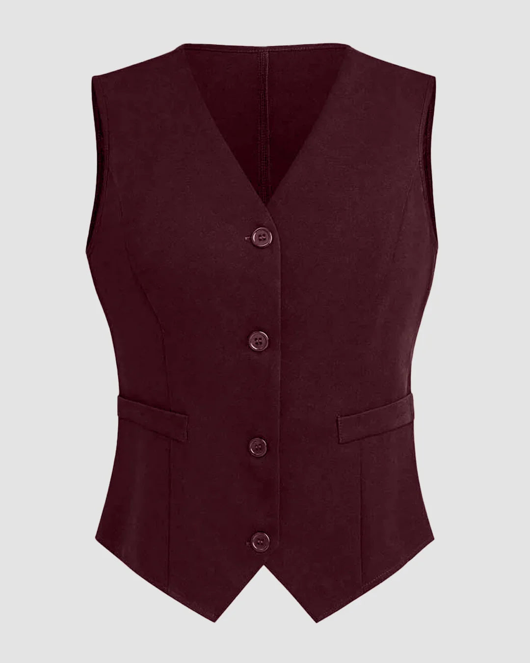 The Front Button Sleeveless Faux Pocket Simple Casual Vest in Dark Maroon is a chic layering essential that elevates any outfit. Designed with a sharp V-neckline, front button fastening, and sleek faux pockets, this sleeveless vest blends casual cool with a tailored edge. The lightweight polyester-elastane blend ensures comfort with a touch of stretch, making it versatile for workdays and evenings out. Add this statement sleeveless vest to your wardrobe for instant style updates.