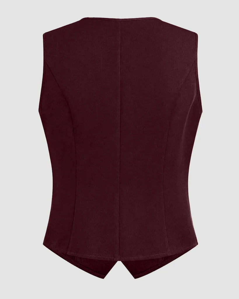 Front Button Sleeveless Faux Pocket Simple Casual Vest in Dark Maroon