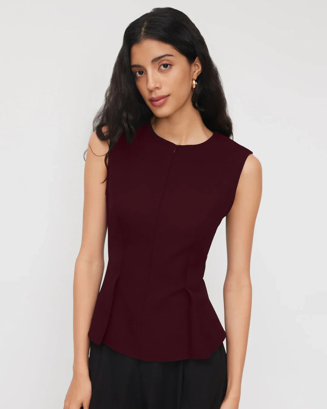 This half zip pleated top brings a sharp, structured look with a clean, modern feel. Designed with a sleek sleeveless cut and subtle pleated shaping, it sits neatly on the body without feeling stiff. The half zip detail adds a polished touch, making the silhouette feel elevated yet easy to wear. Crafted in a smooth, stretch-infused fabric, this half zip pleated top holds its shape while staying comfortable through long hours.