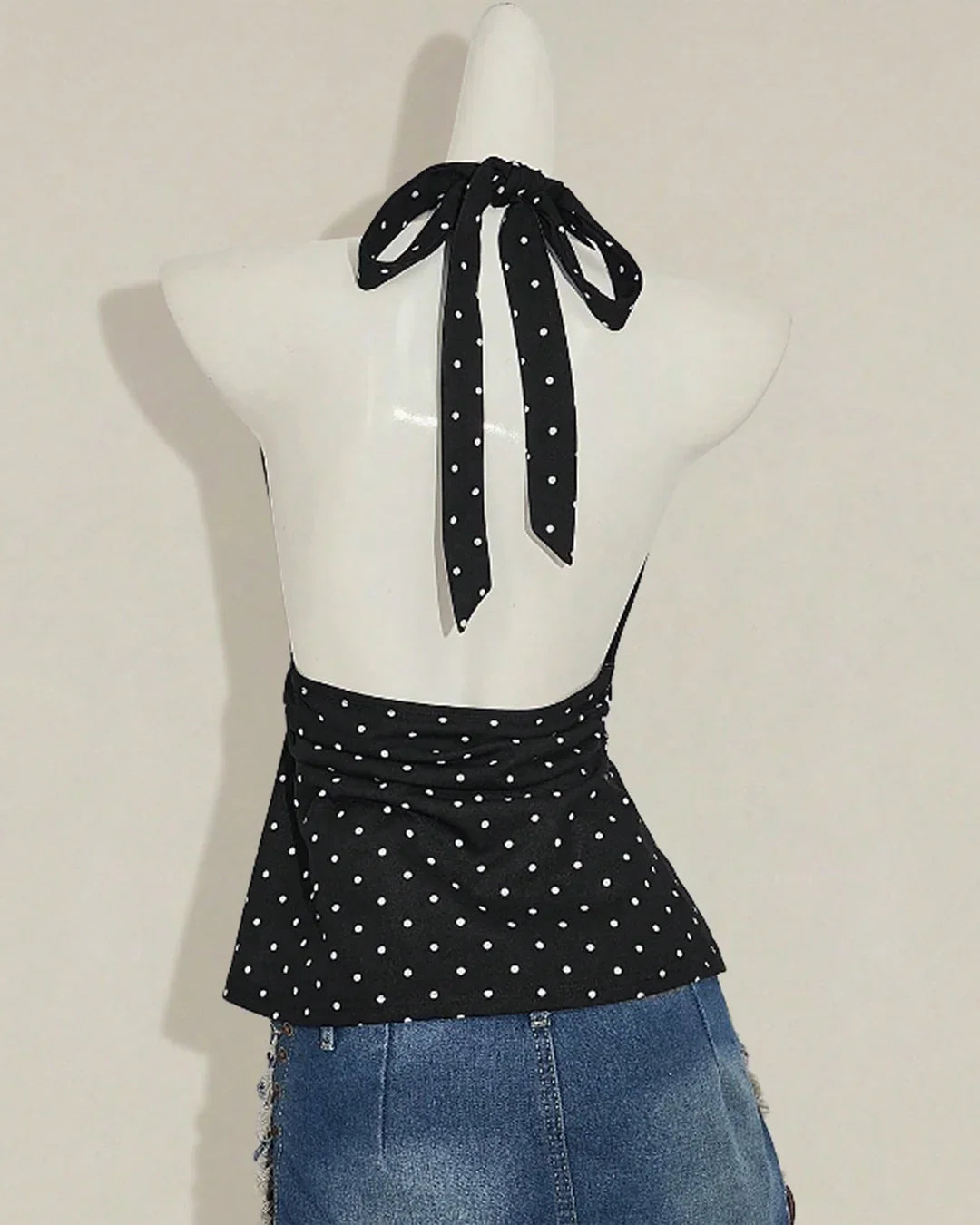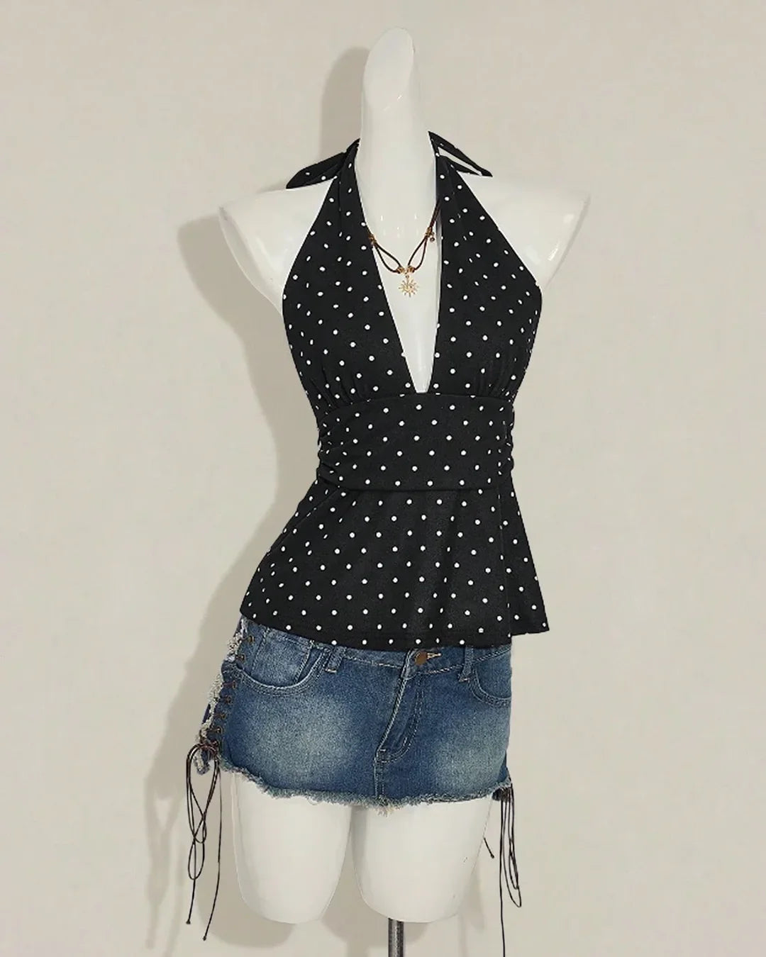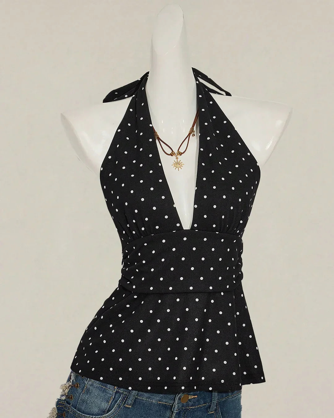 Halter Neck Deep V Polka Dot Wrap Style Top