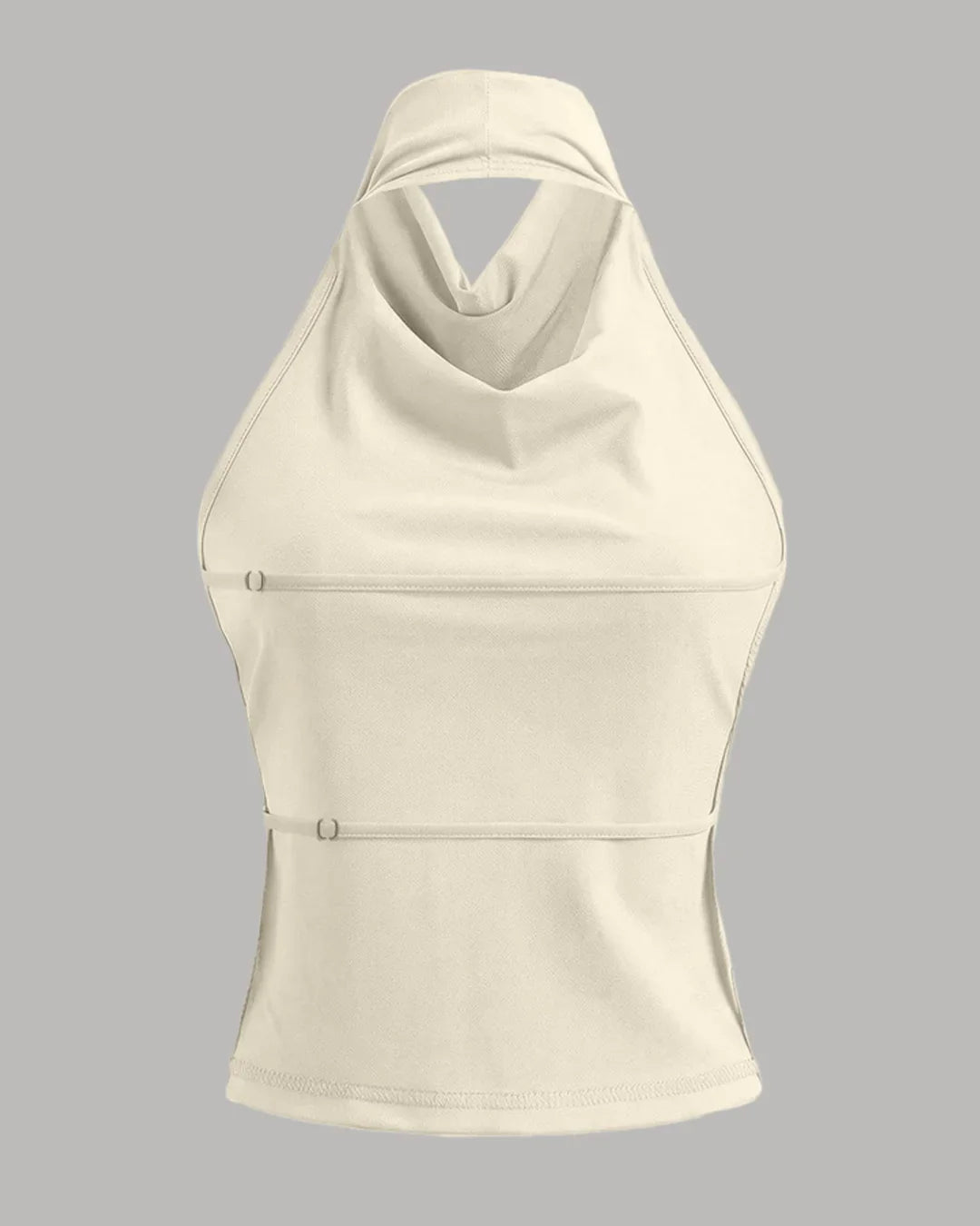 Halter Neck Slim-Fit Straight Hem Solid Sleeveless Crop Top in Beige