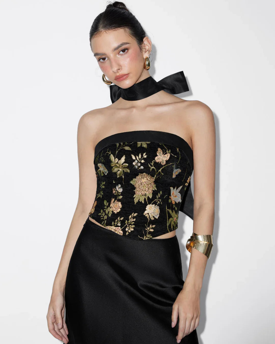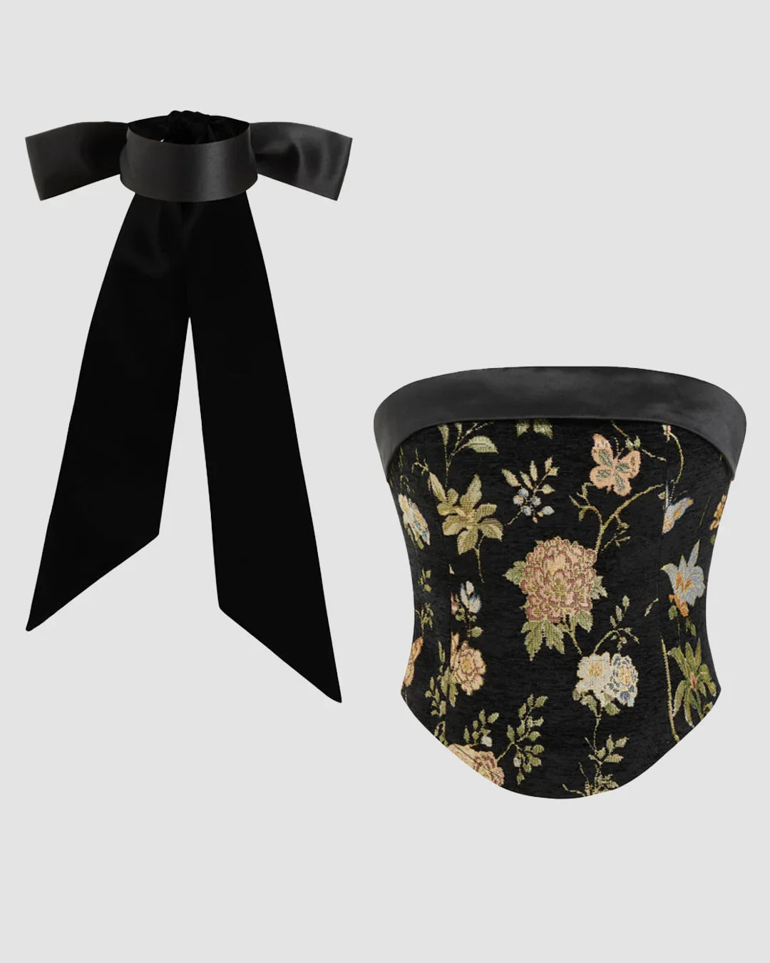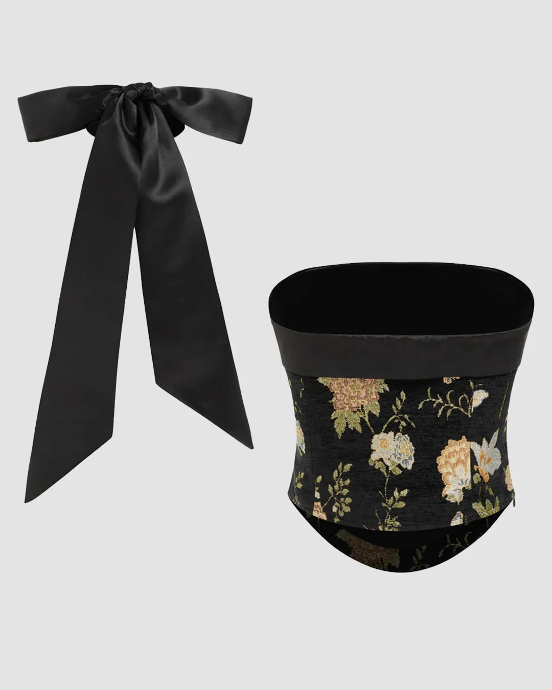 Jacquard Floral Bandeau Crop Top & Satin Bow