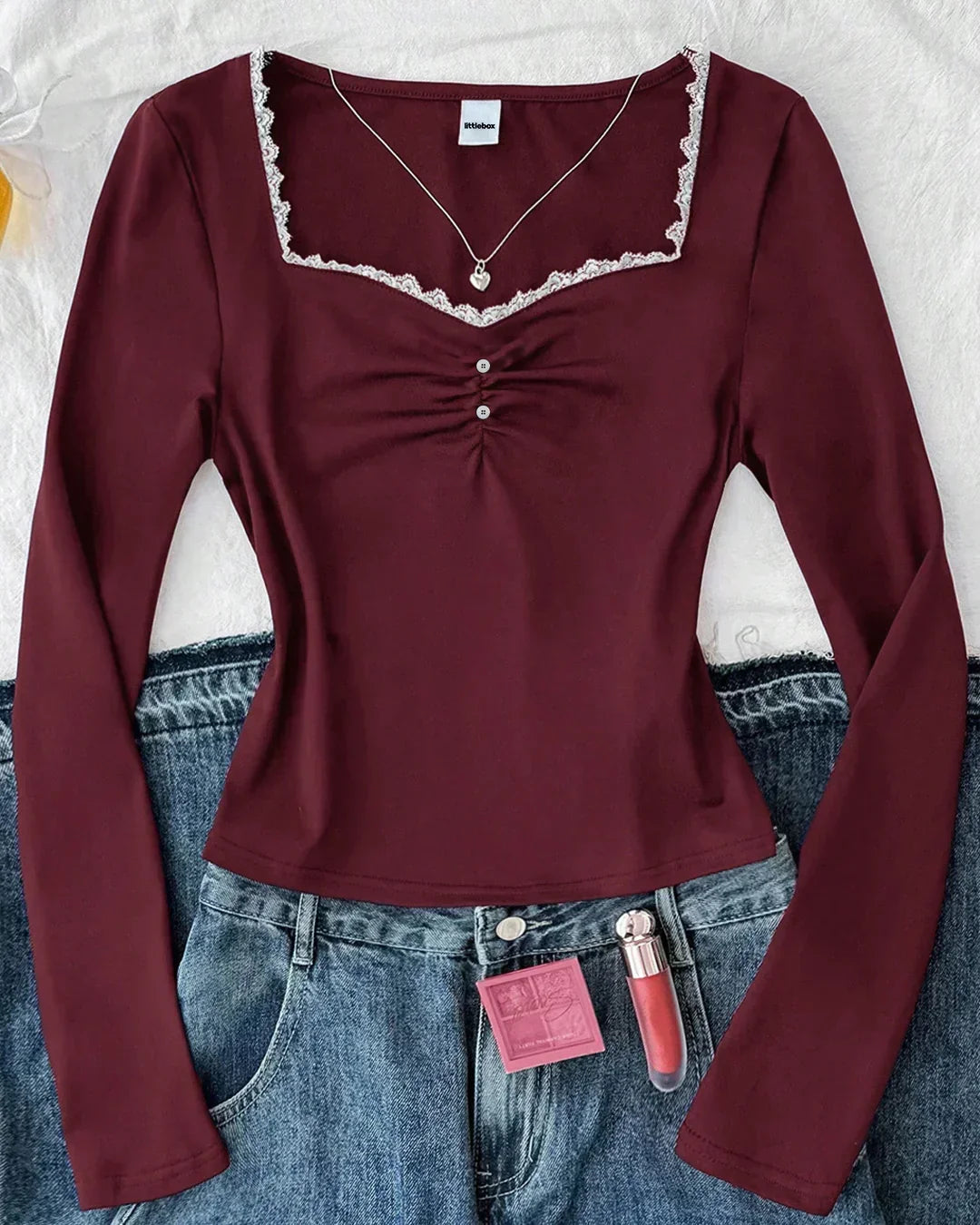 This fitted long sleeve top blends soft knit comfort with delicate lace detailing for a polished everyday look. The square neckline is outlined with subtle lace trim that adds a feminine finish, while the ruched center front with button accents enhances the shape and creates a flattering silhouette.