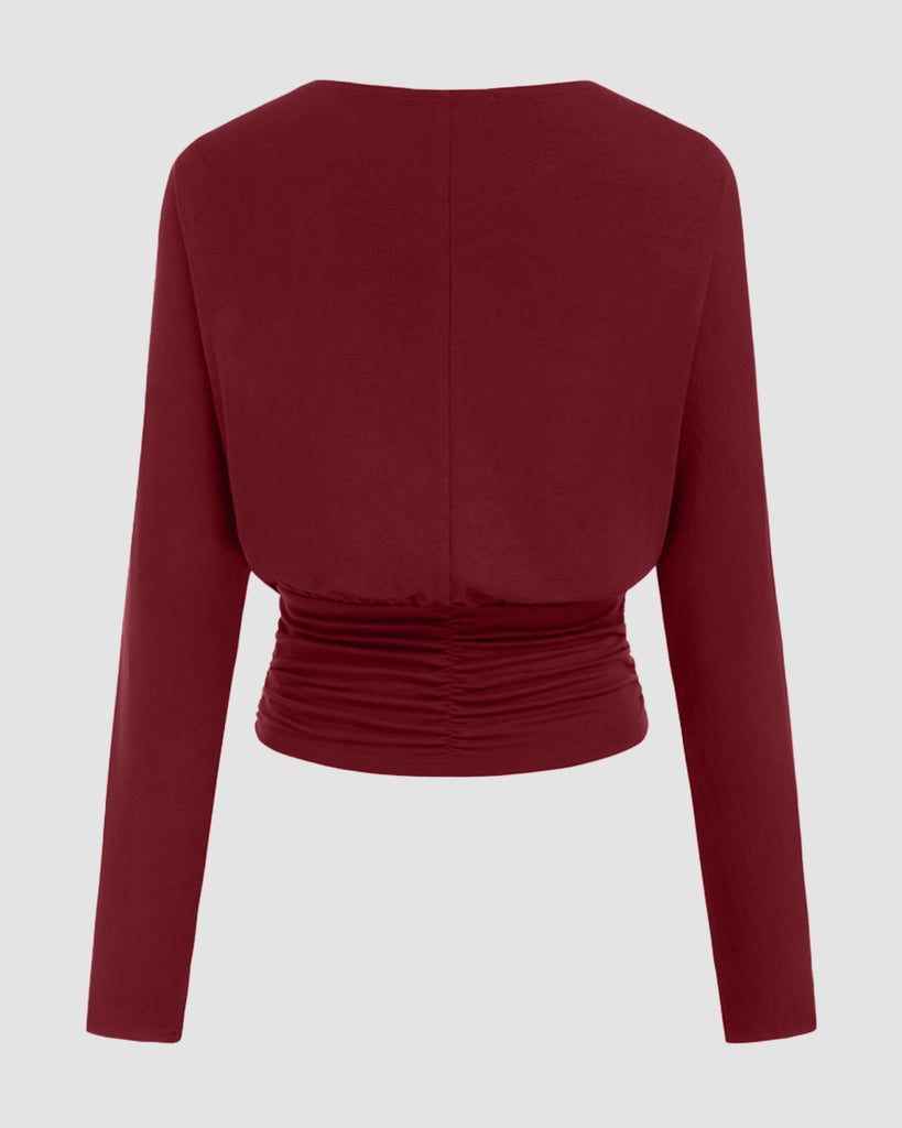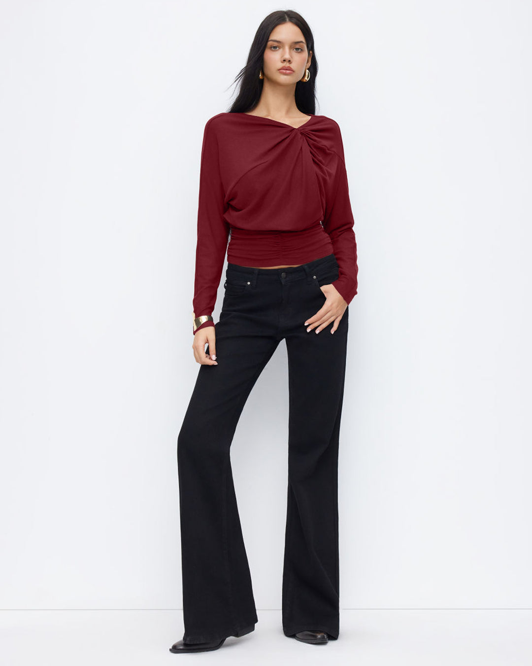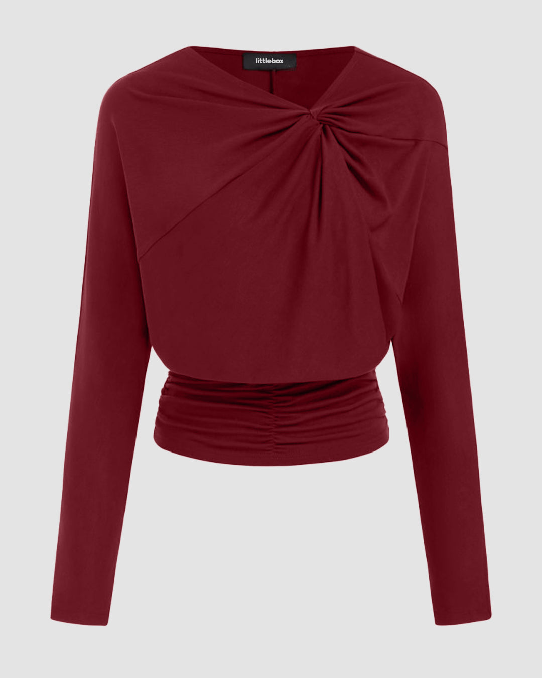 Maroon Asymmetrical Neck Cinched Waist Ruched Long Sleeve Top