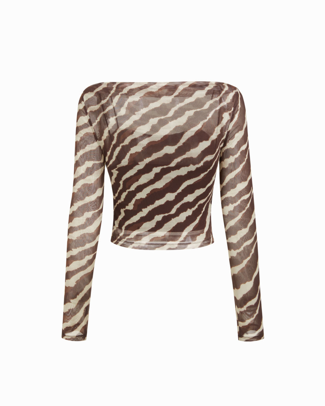 Mesh Leopard Boat Neck Long Sleeve See-through Cami Top