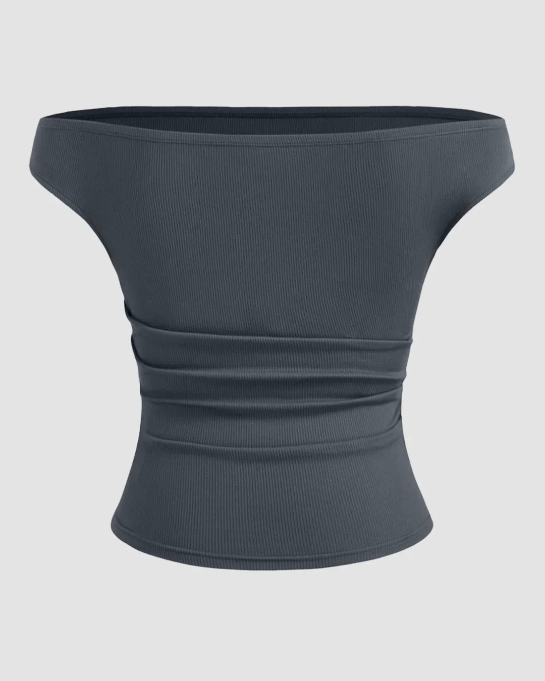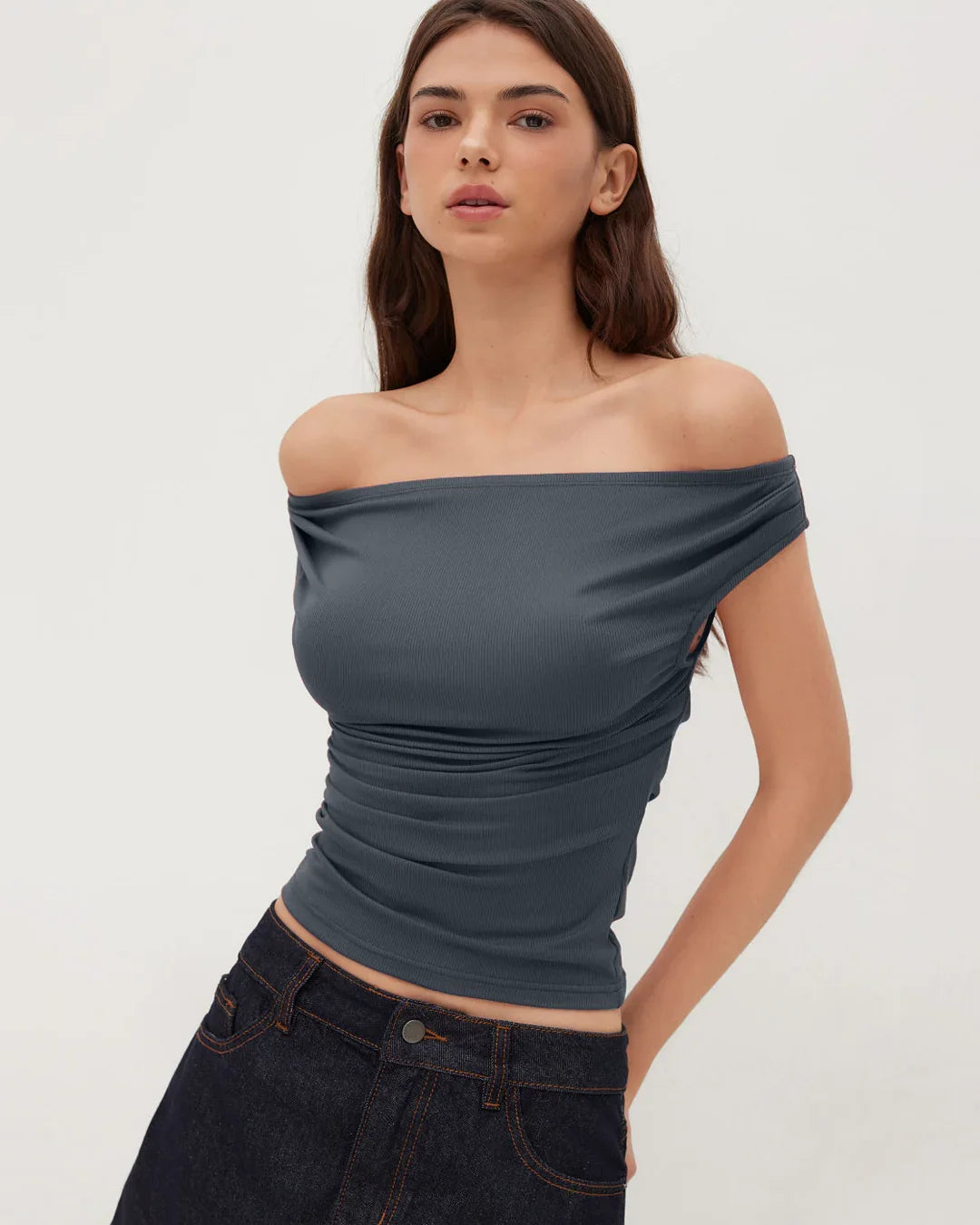 Off-Shoulder Ruched Short Sleeve Top in Dark Grey brings a clean, flattering silhouette with just the right hint of drama. Designed with an asymmetric off-shoulder neckline, this top highlights the collarbone while keeping the look soft and wearable. The ruched detailing through the waist creates a naturally cinched fit, giving shape without feeling tight. Finished with short sleeves and a straight hem, it’s an easy pick for both casual plans and dressed-up evenings.