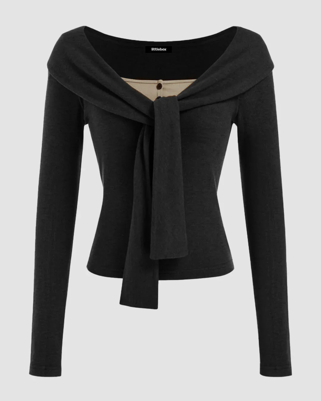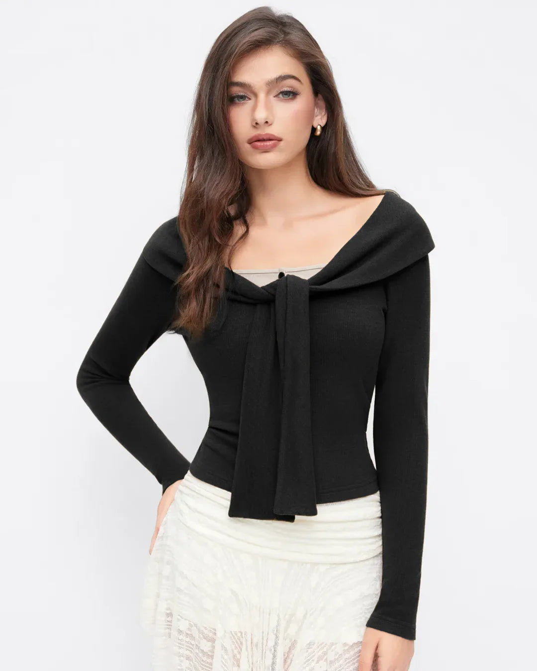 • Black long sleeve crop top with a flattering off-shoulder neckline