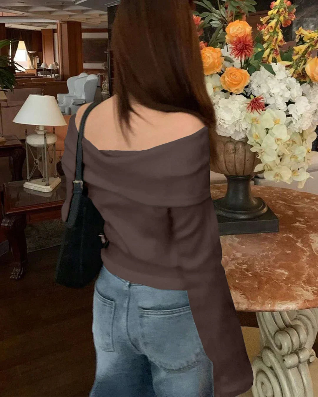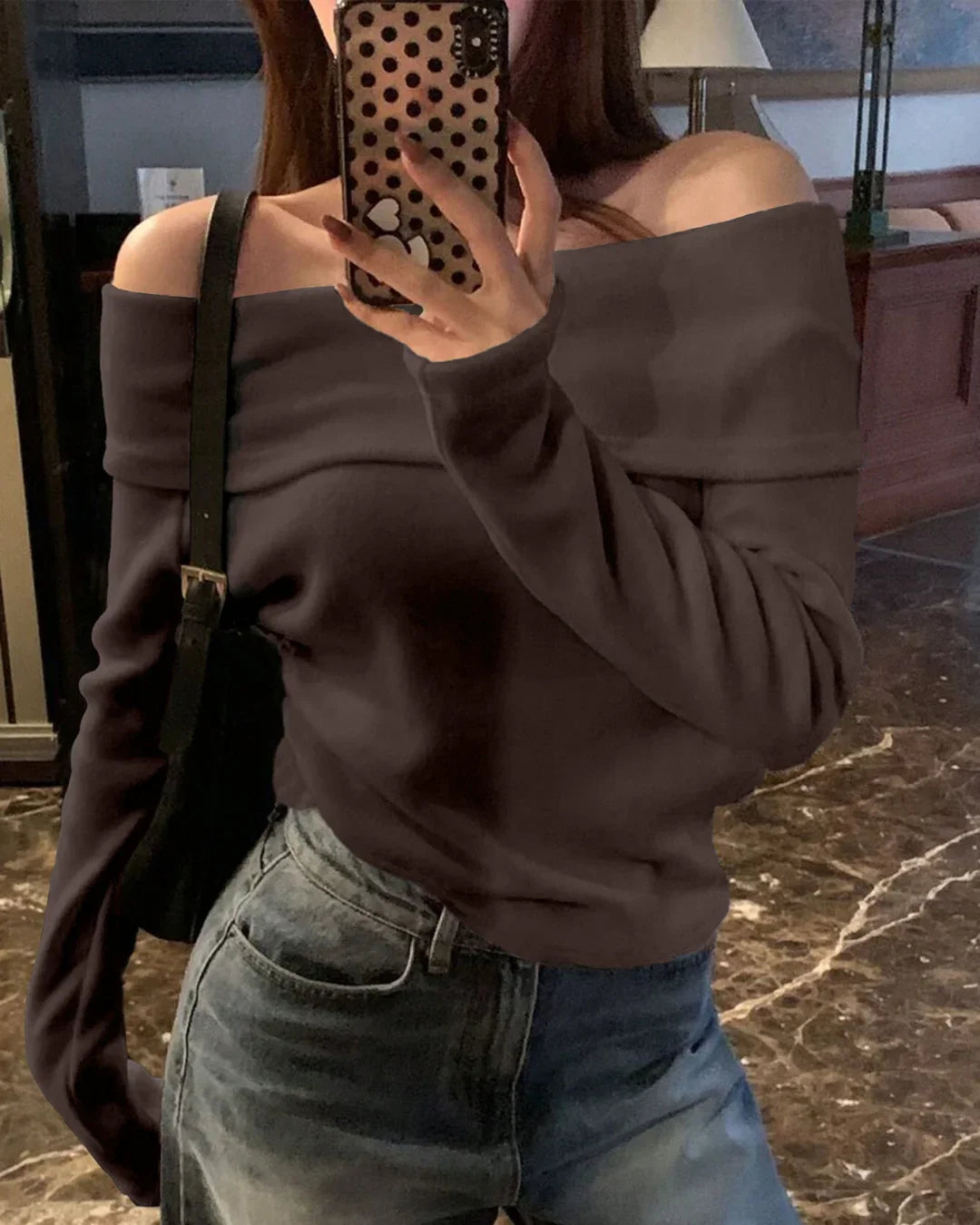Off-Shoulder Slim-Fit Straight Hem Solid Long Sleeve Cropped Top in Chocolate
