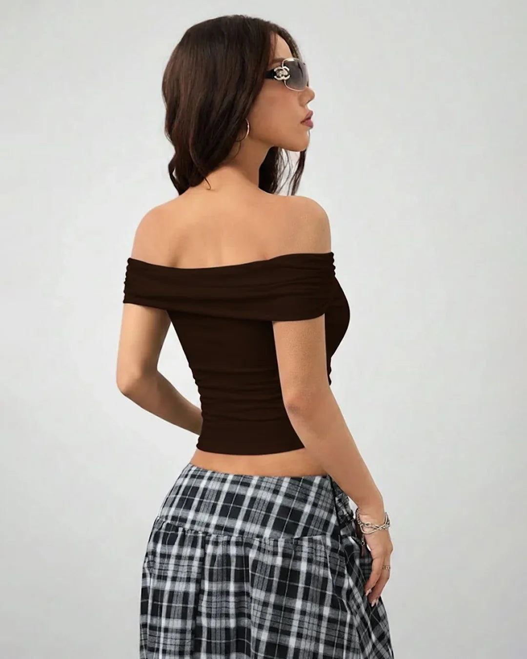 Off-Shoulder Slim-Fit Straight Hem Solid Short Sleeve Top in Brown