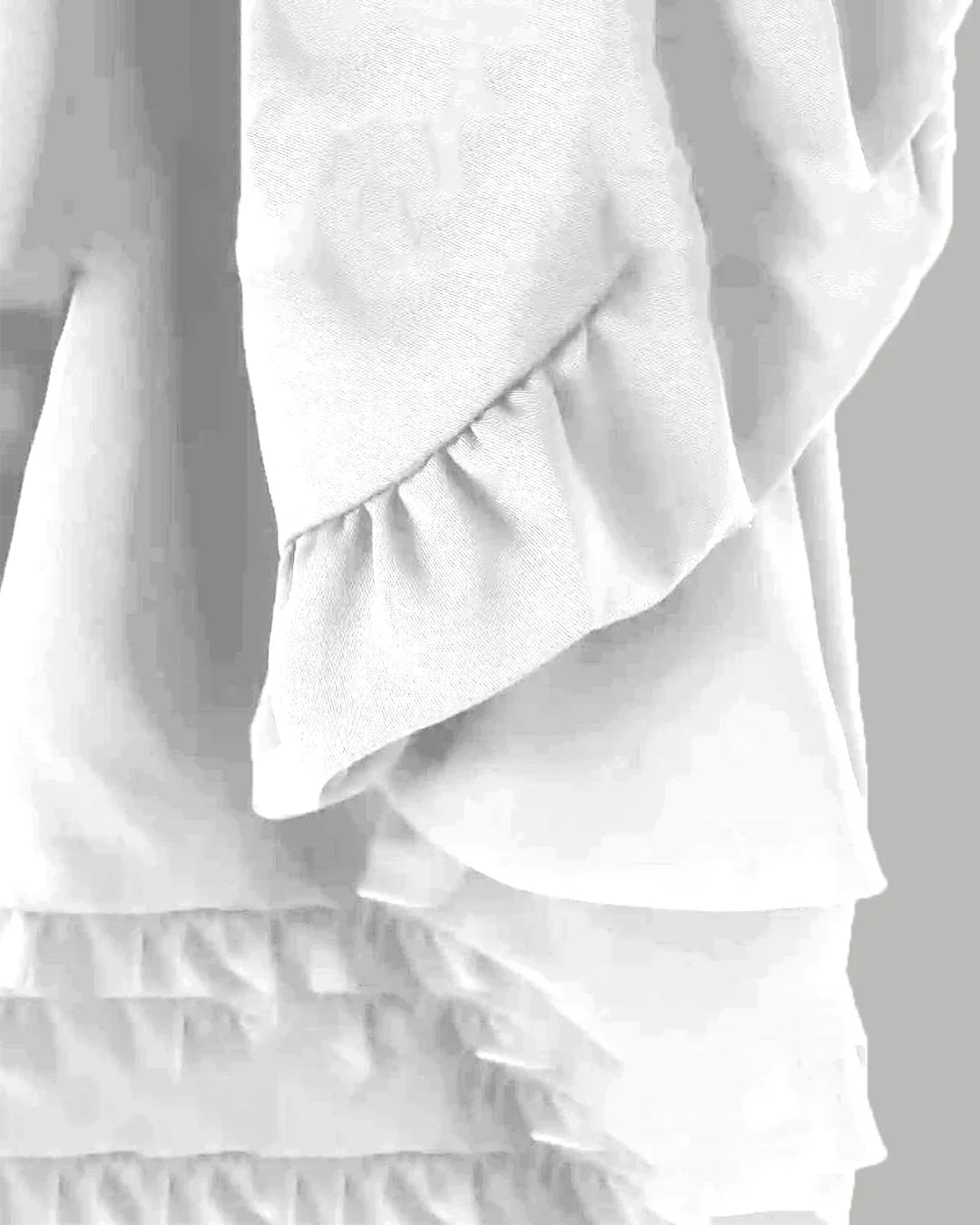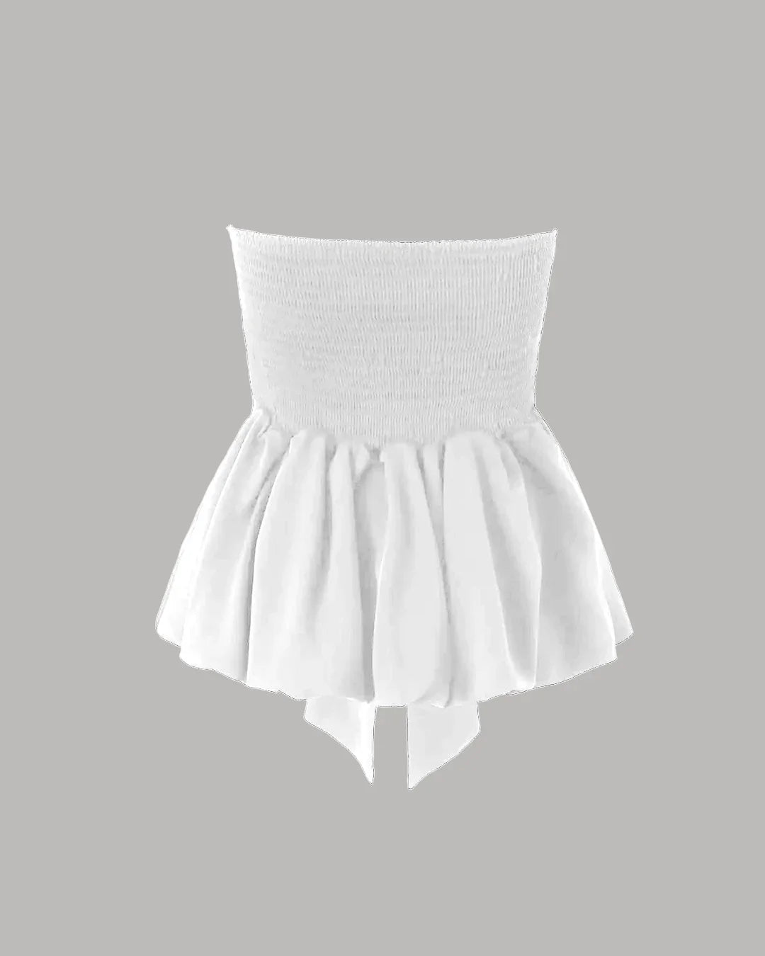 This off white peplum top brings playful elegance with a dramatic front-tie bow and strapless neckline. The cinched bodice flares into a breezy peplum hem, giving your silhouette that ultra-femme flair with minimal effort.