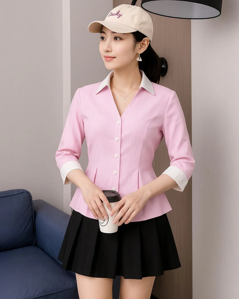 Pink Peplum Button-Down Shirt with Contrast Cuffs