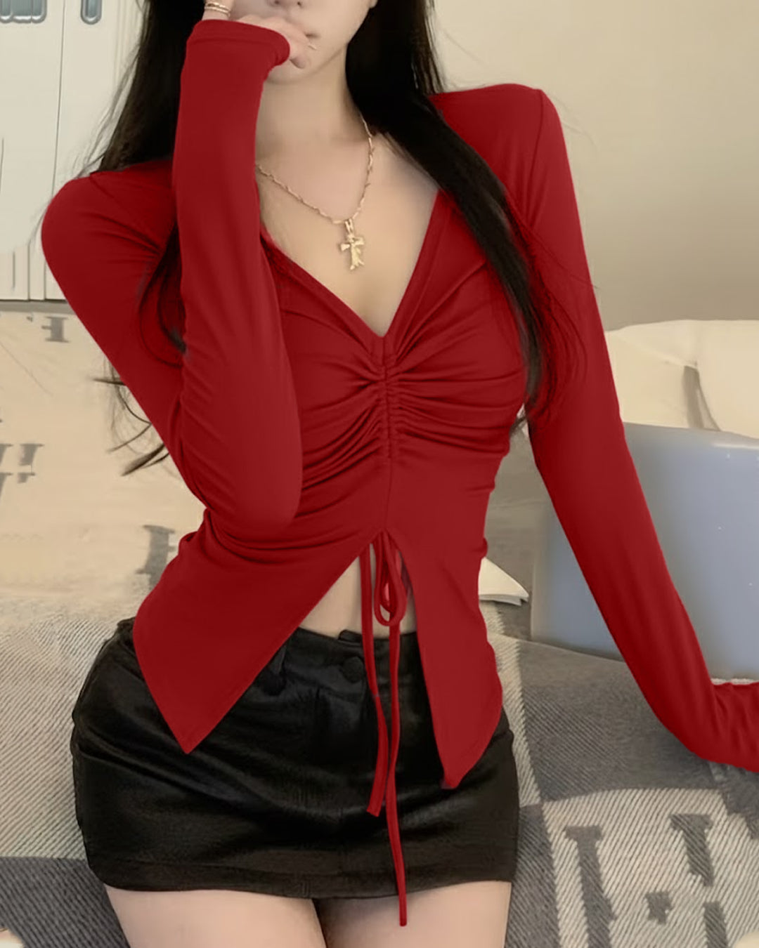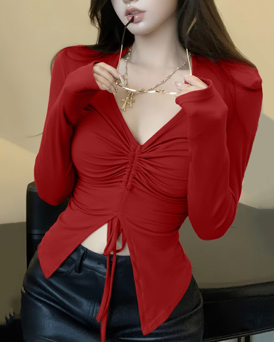 Red V-Neck Long Sleeve Fitted Top with Front Slit