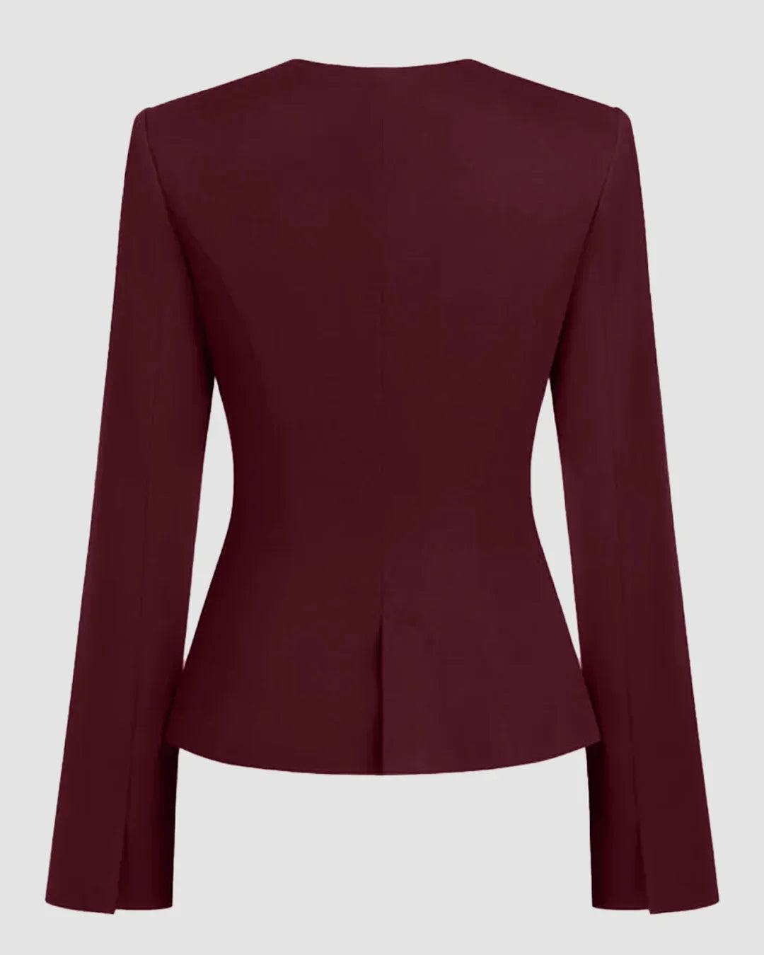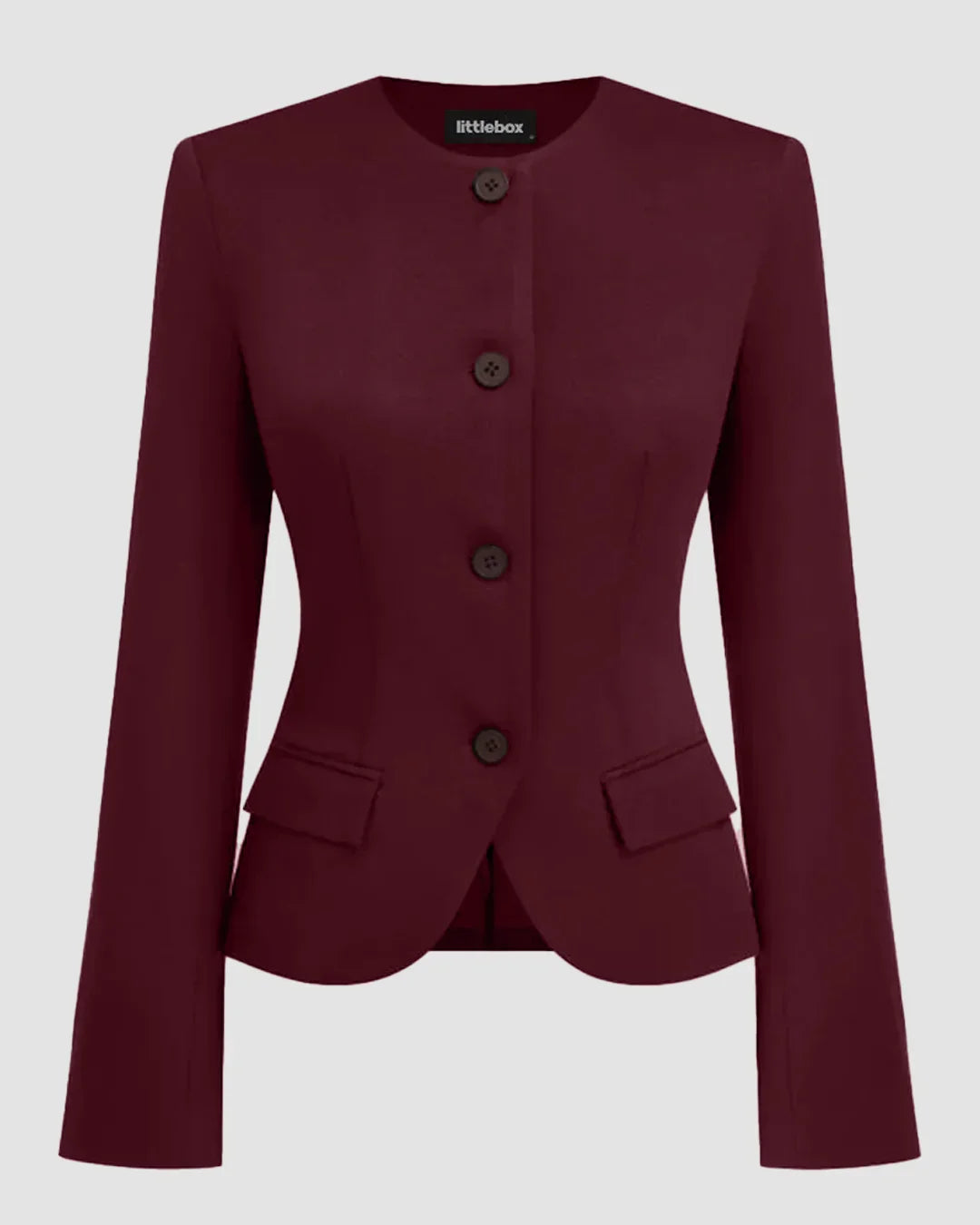 Round Neck Button Long Sleeve Suit Jacket In Burgundy